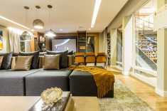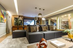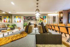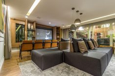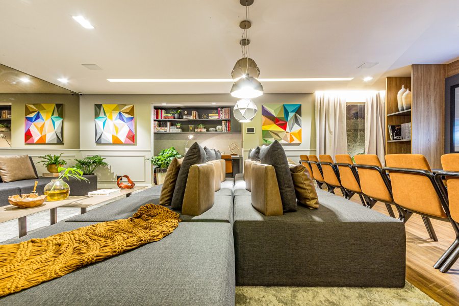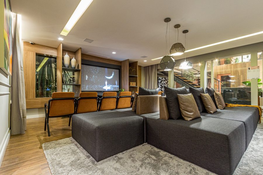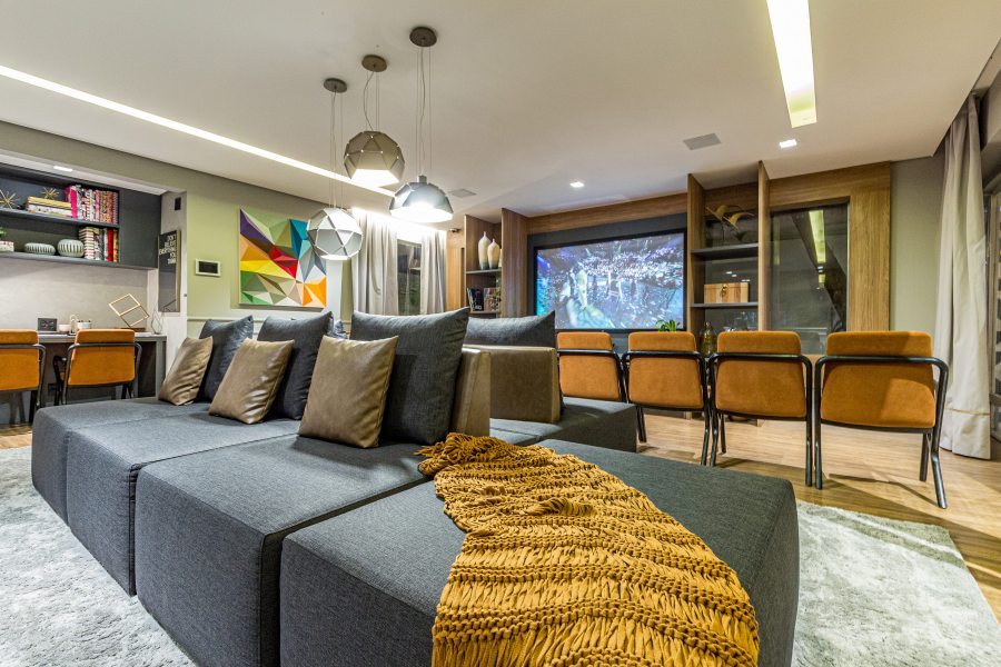 Para a Sala Multifuncional, o ponto de partida da designer de interiores foi a exploração do estilo contemporâneo com base neutra. E tudo foi trabalhado para que todo o ambiente agregasse tecnologia e interação, sem perder a atmosfera de lar. “Esse foi um ponto que mudou bastante do conceito antigo de sala de estar. Hoje temos uma quantidade muito superior de equipamentos eletrônicos e a necessidade de considerar o wifi, fundamental para a utilização dos smartphones, o notebook no home office e para assistir na televisão os títulos de filmes oferecidos nas plataformas de streamings”. Dessa forma, a estrutura de elétrica e cabeamento de internet devem fazer parte do projeto da nova sala de estar.