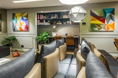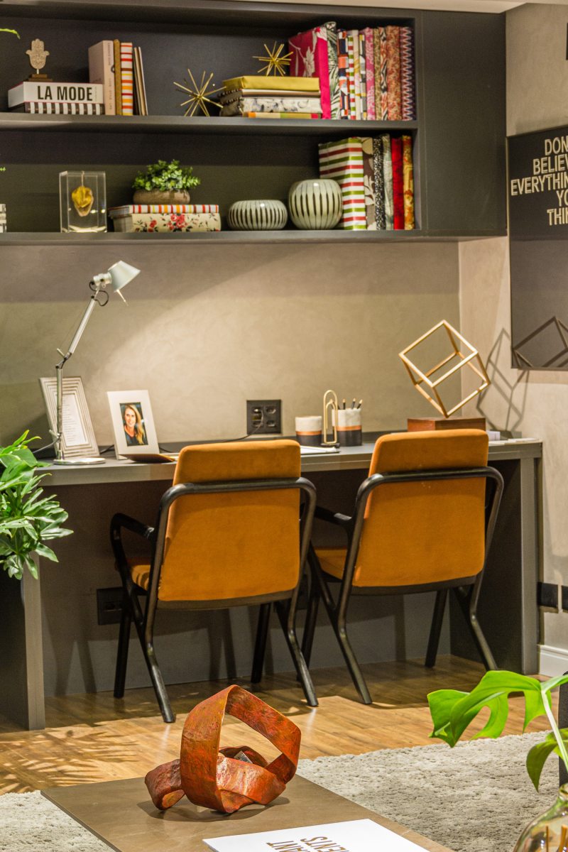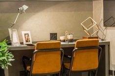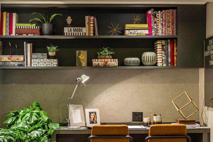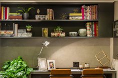Para conceber essa separação imaginária, o pórtico foi desenhado para receber o home office. O cantinho foi pensado com a aplicação da marcenaria para a bancada com duas posições e nichos que recebem livros e até mesmo pastas pessoais. “Cada vez mais o trabalhar em casa e o estudar se fazem presente na vida das pessoas. Não dá para improvisar na mesa de jantar ou sentado no sofá com o notebook no colo. A decoração nos permite construir um ambiente próprio para isso, contribuindo para os resultados pessoais do morador”, acrescenta Simone.