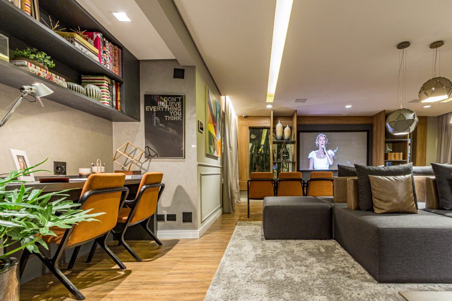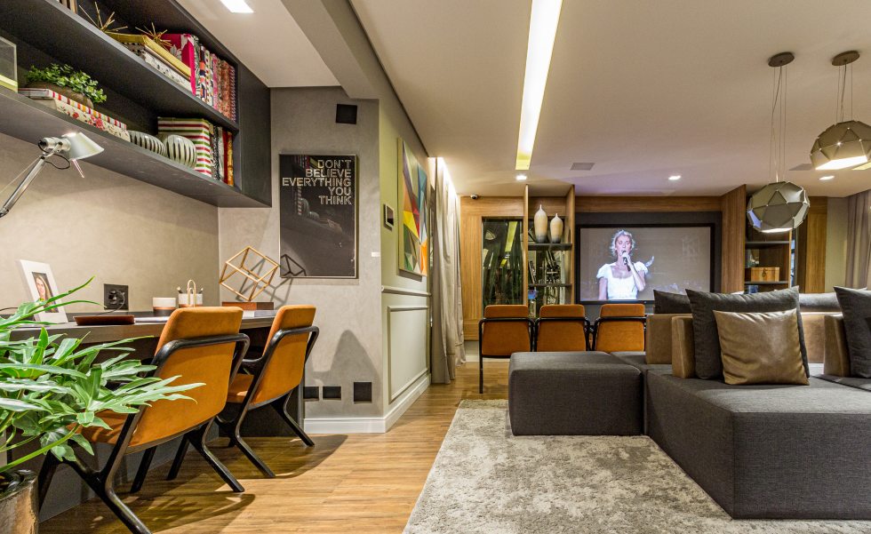 A integração segue uma tendência nos projetos. Além de promover a convivência entre os moradores, otimiza espaços – no caso de imóveis menores – e responde também ao comportamento dos moradores passarem mais tempo em casa, principalmente para aqueles que fazem a prática do home office. “Poder trabalhar, interagir e descansar no mesmo ambiente é bem bacana e esse pedido por parte dos clientes tem sido cada vez mais recorrente”, conta Simone.