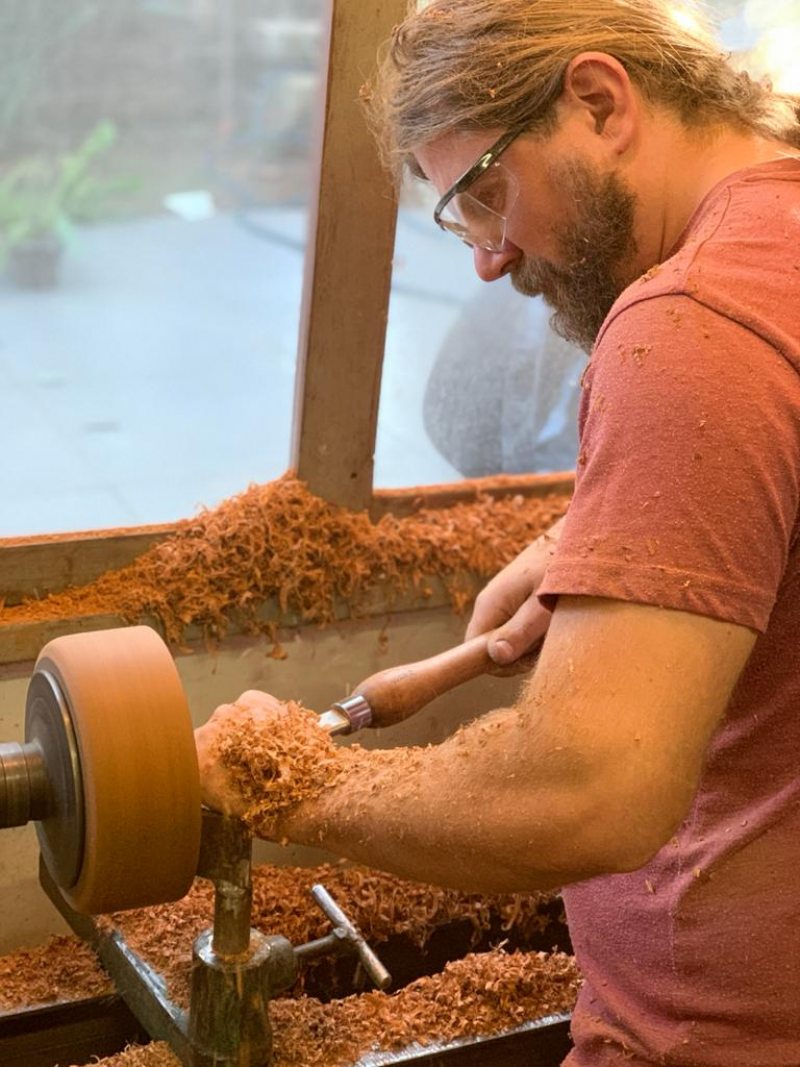 Já falei que Patrick é maker, vou provar. Ele gosta tanto de resolver por conta suas necessidades que reformou 100% sua Vespa, a motocicleta foi completamente restaurada por ele. Além disso, em sua nova coleção, usa o torno de madeira como ferramenta principal. Como há muito tempo desejava aprender a tornear, comprou um torno antigo, aprendeu a manipular e o consertou, dando uma turbinada na máquina.