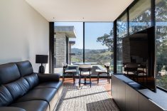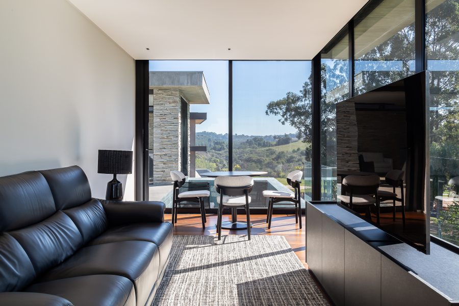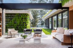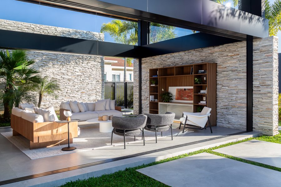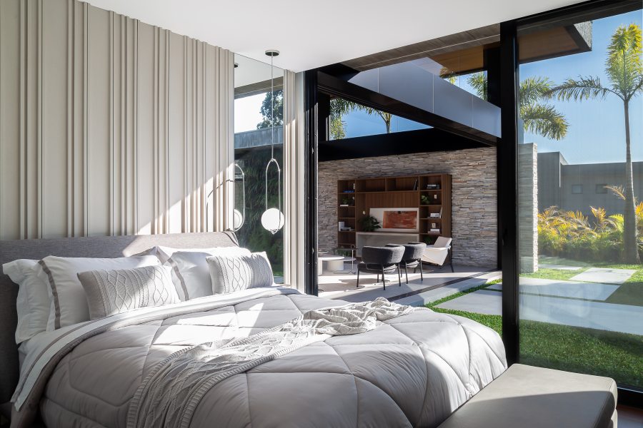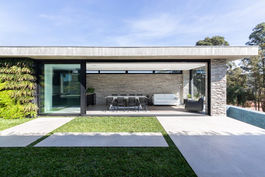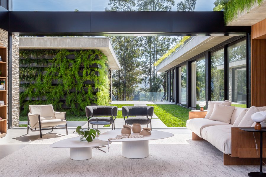 A implantação cuidadosa do imóvel garantiu o máximo aproveitamento da iluminação natural e máxima interação com a paisagem do entorno. Na sala de estar principal, com pé-direito duplo e tapetes de textura discreta da Persépolis Tapetes, as esquadrias se recolhem completamente para dentro das paredes para transformar a área social em uma agradável varanda.