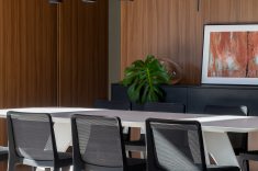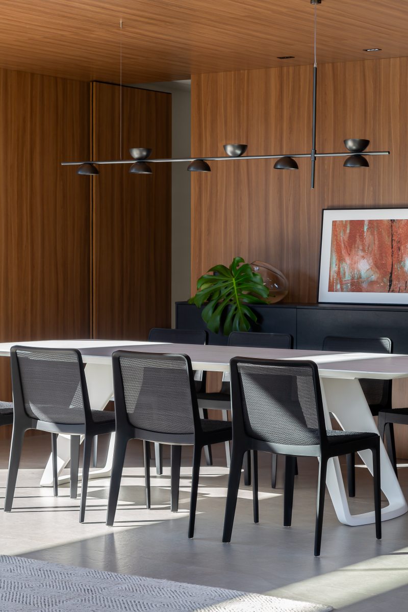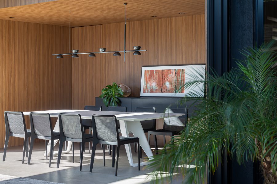 Ao lado, a sala de jantar revestida por painéis de marcenaria sob medida, oferece uma atmosfera acolhedora perfeita para receber convidados. Além do impacto estético, os painéis de madeira ocultam os acessos à cozinha e à área de serviços.