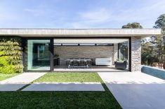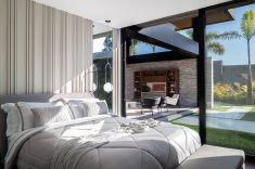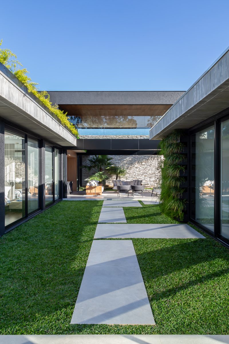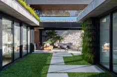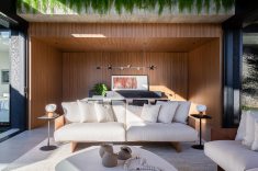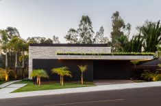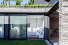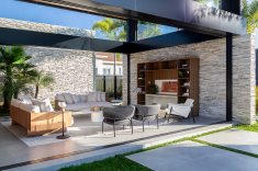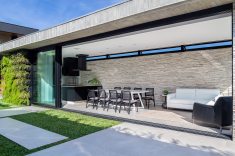 Para garantir a privacidade as fachadas externas foram preenchidas por paredões ininterruptos, ao passo que as fachadas internas, voltadas para os jardins, foram totalmente revestidas por panos de vidro com abertura total. Para equilibrar a leveza proporcionada pela transparência das janelas os profissionais utilizaram concreto, pedra natural e madeira, compondo cenários sofisticados decorados com o mobiliário de design da Ton Sur Ton.