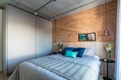 O industrial também compreende a combinação com materiais e tons mais leves – caso da cabeceira de madeira clara e as cores vivas das almofadas | Foto: Guilherme Pucci
