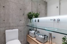 Neste banheiro, o cimento queimado da parede encontrou a leveza do vidro da bancada e da marcenaria do móvel| Foto: Guilherme Pucci