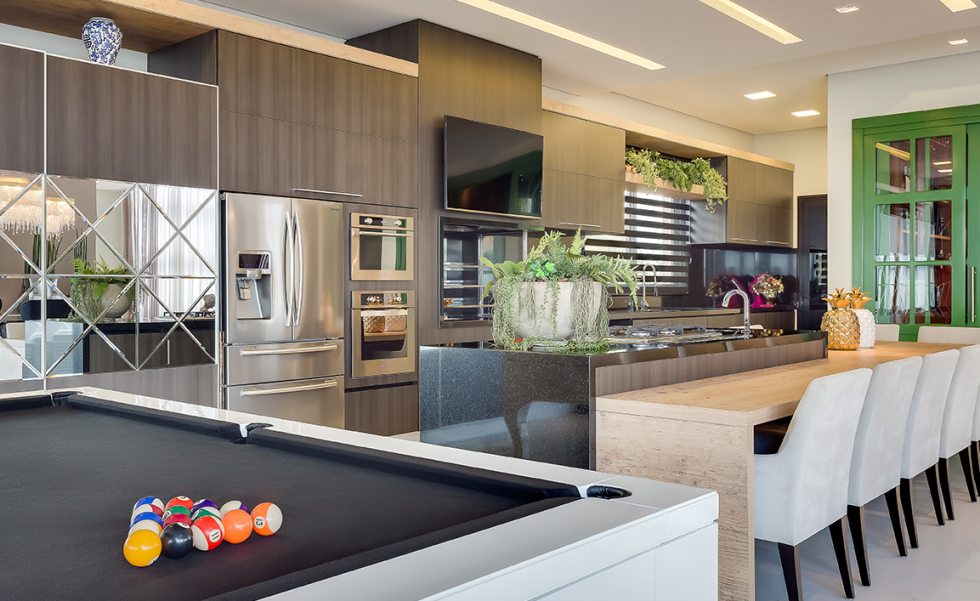 A proposta inclui um bar de estilo inglês com porta verde e uma mesa de sinuca na própria cozinha.