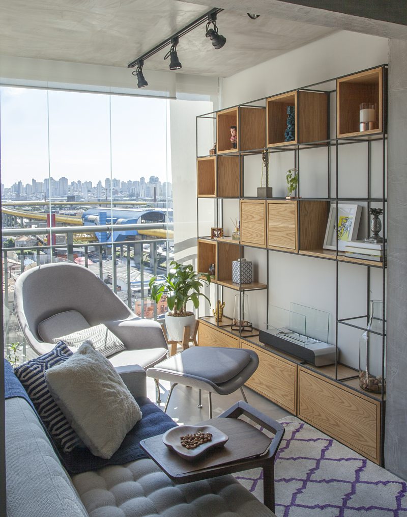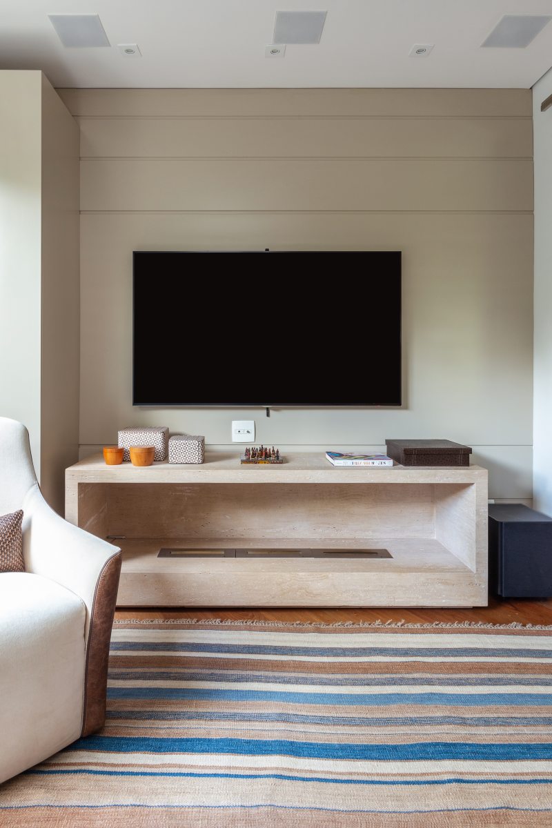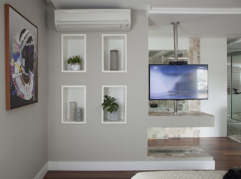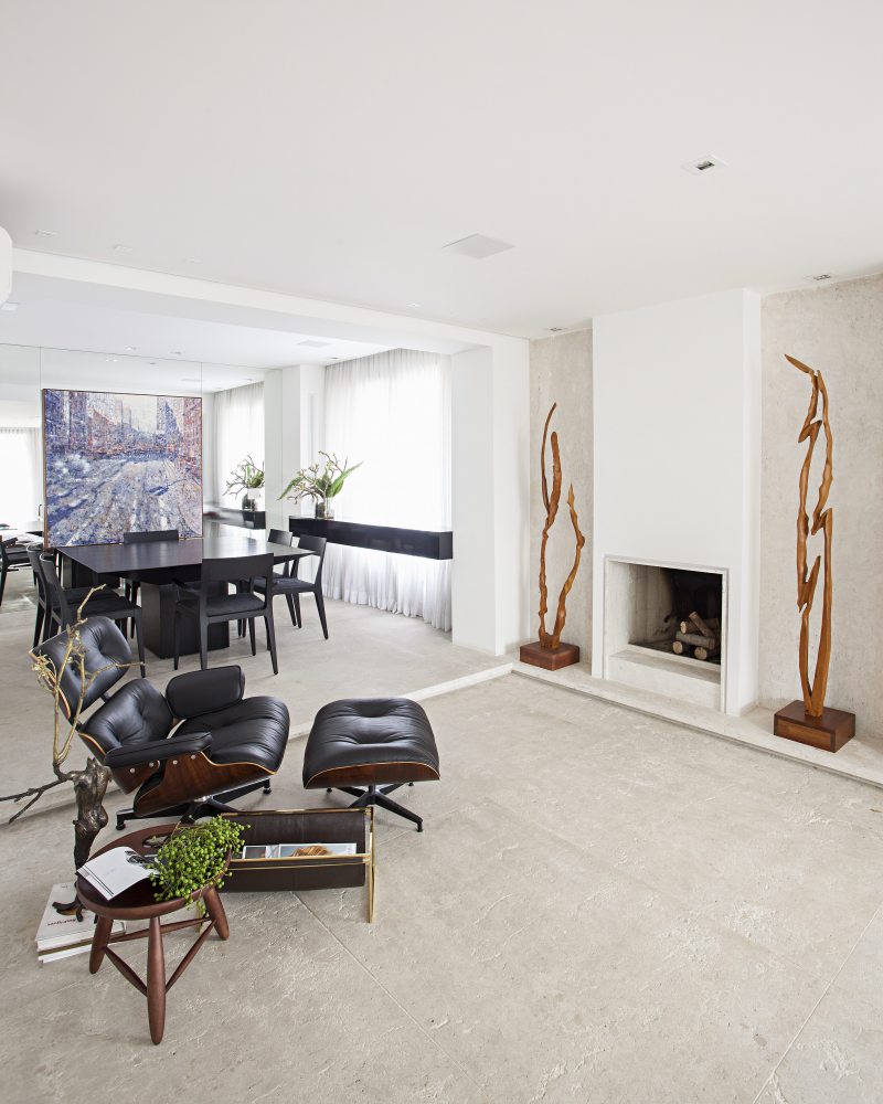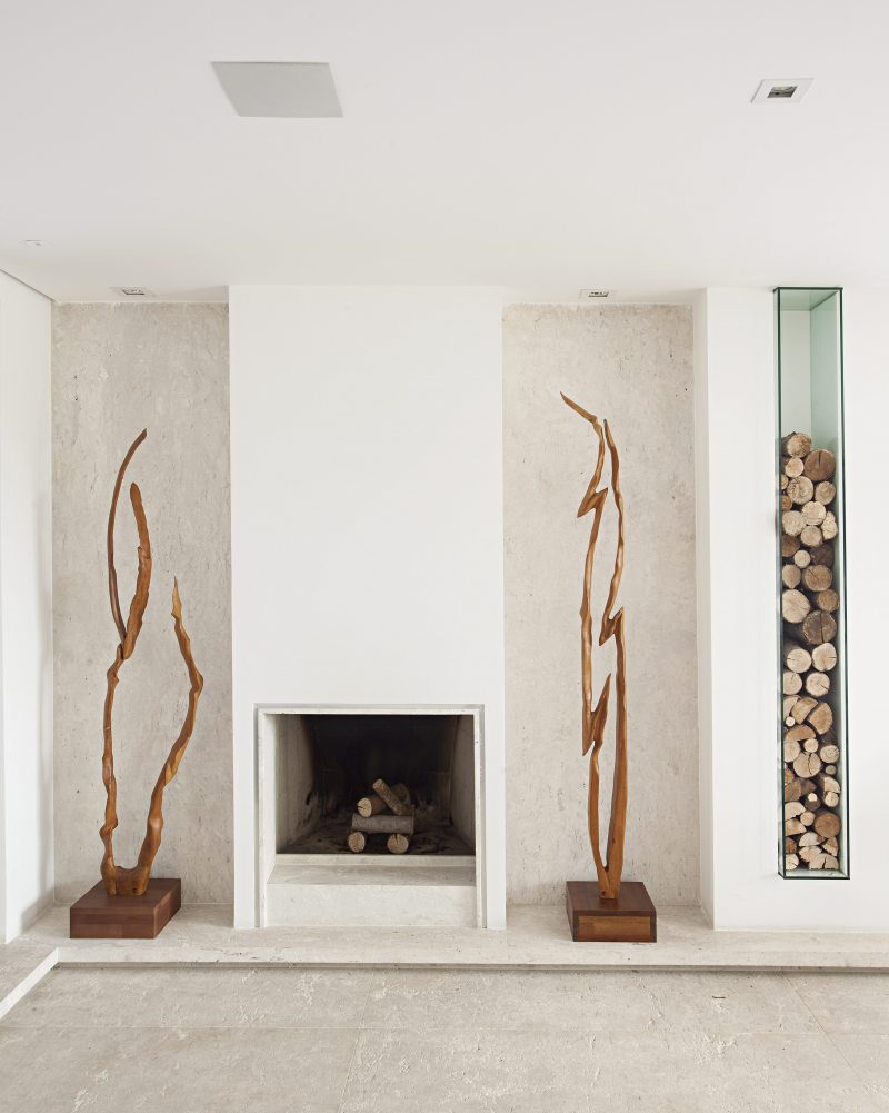 No projeto assinado por Ieda Korman, do escritório Korman Arquitetos, a lareira tradicional já existia na planta original. Após a reforma, a sala de estar ganhou um nicho com específico para guardar lenha e a lareira virou o destaque do décor graças a esculturas de madeira lado a lado.