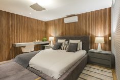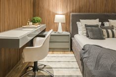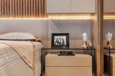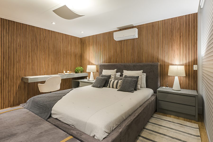 A marcenaria é um fato importante para agregar uma sensação de intimidade ao ambiente. No caso desse projeto, a escolha da arquiteta Bruna Souza foi o painel ripado para o quarto. A madeira é um dos principais elementos para proporcionar aconchego ao décor, junto ao modelo ripado, foi possível combinar um elemento tradicional com a estética contemporânea.