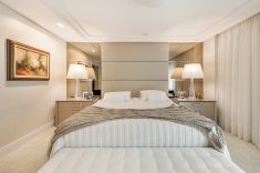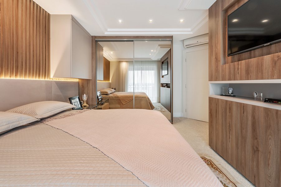 A decoração do quarto requer uma atenção especial, um elemento importante para compor o ambiente é o espelho. Além da usabilidade, o espelho também oferece uma sensação de amplitude ao espaço. Usado em lugares estratégicos, como nesse caso, na porta do armário, proporciona uma maior sofisticação ao cômodo.