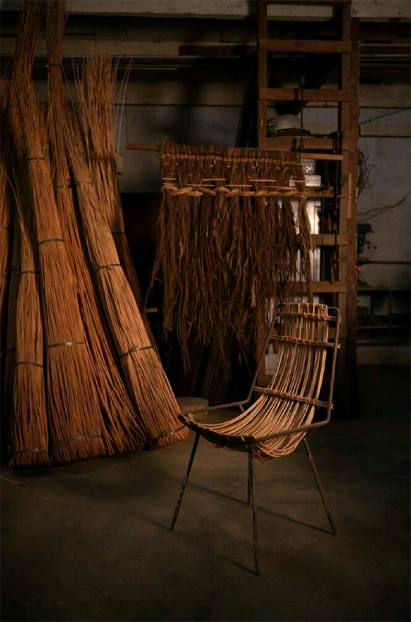 Fui para casa e voltei inspirada no segundo dia. Toda a matéria-prima precisa ser umedecida ou mergulhada em água por um bom tempo para se tornar flexível, como eu não havia deixado o material de molho no dia anterior, resolvi trabalhar com o material seco. Para isso precisei encontrar uma base que possibilitasse uma curvatura à seco, foi então que dei de cara com uma estrutura de cadeira em aço carbono, toda enferrujada e muito minimalista. Deu match, era ela!