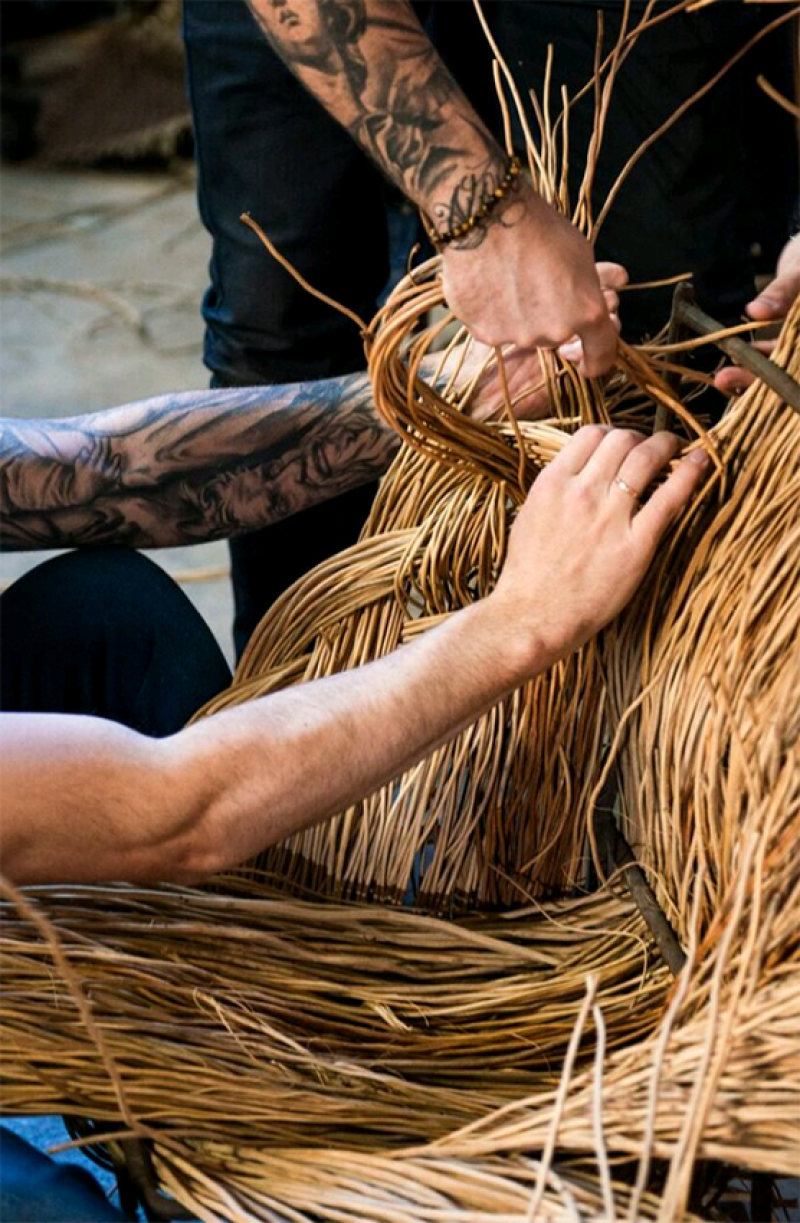 Cada um dos 11 convidados teve passe livre para criar uma ou mais peças, usando vime e junco como base. No galpão dos Túlios tivemos muitas opções de bases para serem trabalhadas, muitos esqueletos bacanas em aço carbono. A pressão inicial me deixou um pouco ansiosa, afinal, poxa vida, eram outros 10 convidados muito talentosos e a presença do Humberto. O primeiro dia foi de descobrimento e tentativas, conhecer os materiais e ter o insight de onde usá-los.