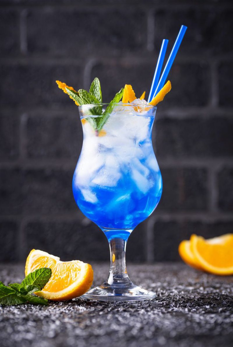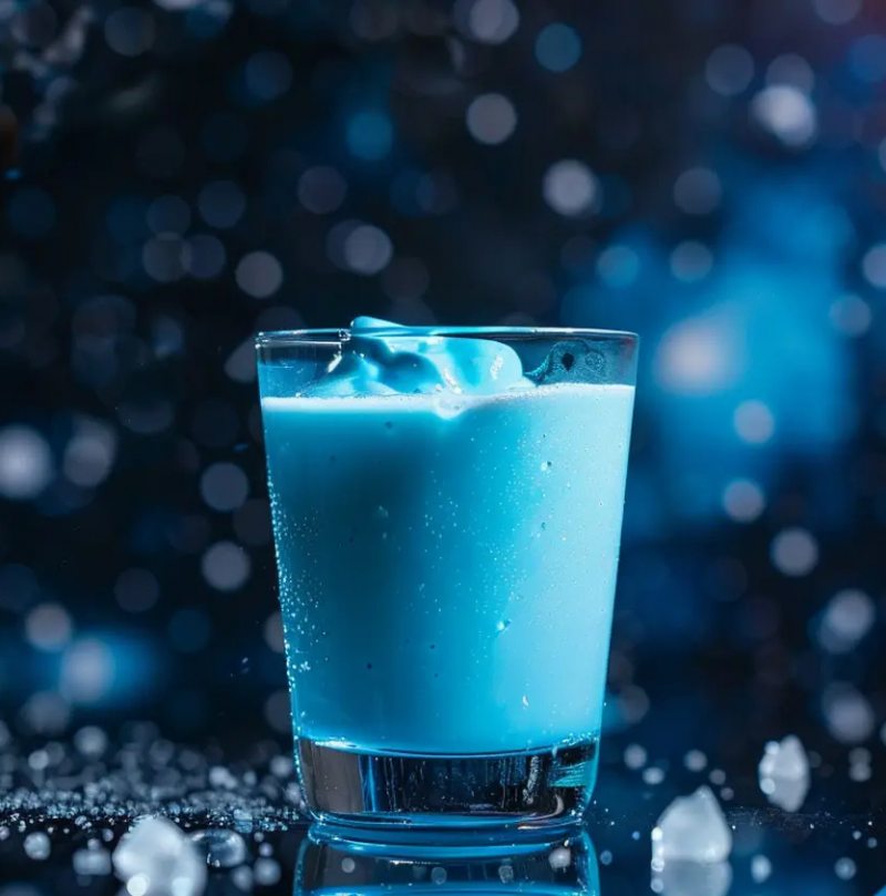 Bata com gelo e sirva em copo baixo, decorado com cristais de açúcar azul.
