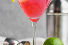 Misture em coqueteleira com gelo, coe em taça de martini gelada e finalize com um twist de casca de limão.