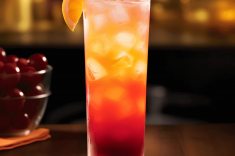 Monte no copo longo com gelo, deixando a grenadine descer lentamente para criar o degradê.