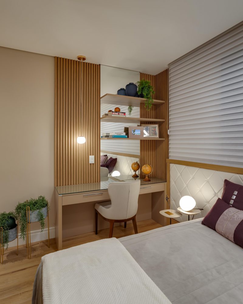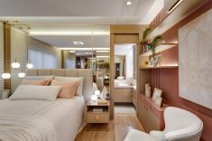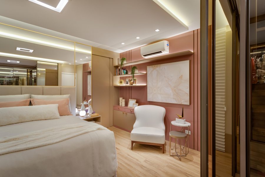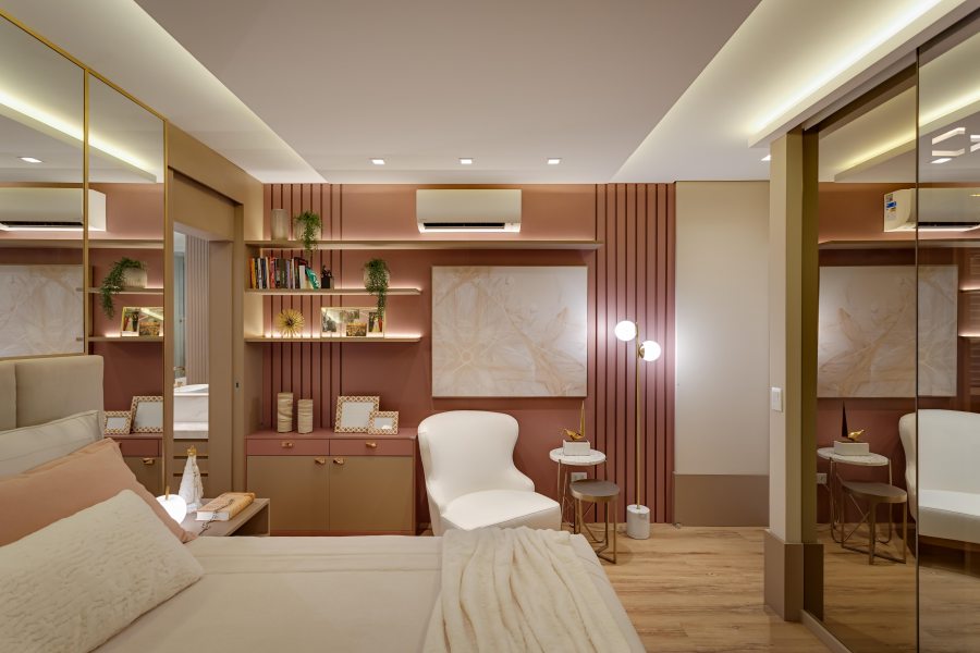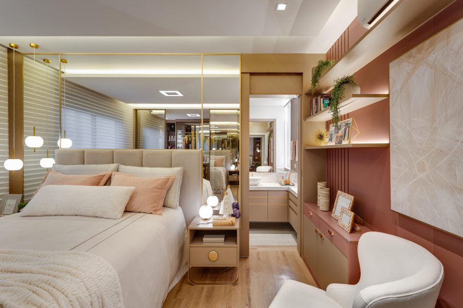 A paleta de cores,com predomínio do rosa, dourado, bronze e branco, criou uma atmosfera de aconchego e feminilidade. Como a personalização é uma das marcas da arquiteta Ana Cristina Avila, os móveis planejados o criado mudo recebeu peças metalizadas desenhadas especialmente para o espaço.