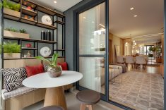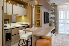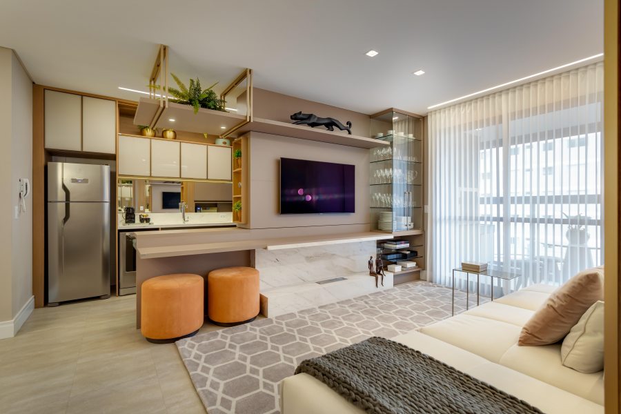 Na sala de estar, a lareira em mármore faz contraste com o painel de madeira, garantindo um ambiente moderno e que, ao mesmo tempo, transmite a sensação de conforto e bem-estar. Os filetes dourados também aparecem em detalhes super delicados, agregando grande diferencial à composição.