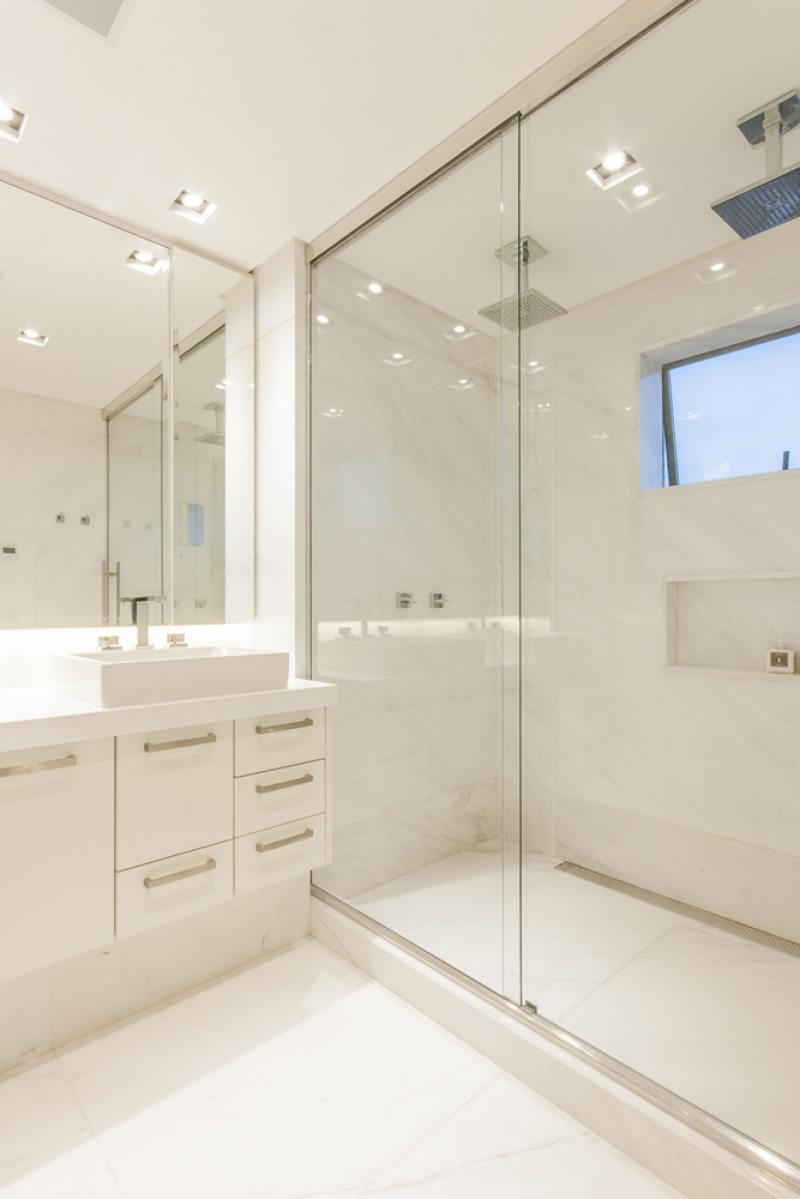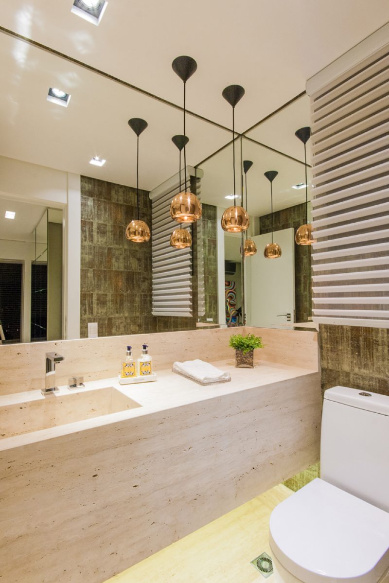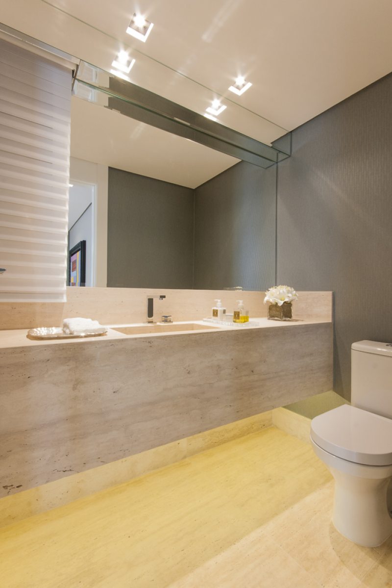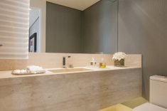 No terraço, a piscina e deck anteriores foram trocados por uma sauna e spa, decorados ao fundo com uma parede verde com irrigação. A churrasqueira desta parte da casa conta com cooktop, espetos elétricos e cervejeiras, fazendo a linda cozinha gourmet ter um estilo próprio para receber visitas confortavelmente. Todos os lavabos ganharam piso e bancada de mármore Travertino Romano e papel de parede contemporâneo, integrando o estilo próprio do projeto.
