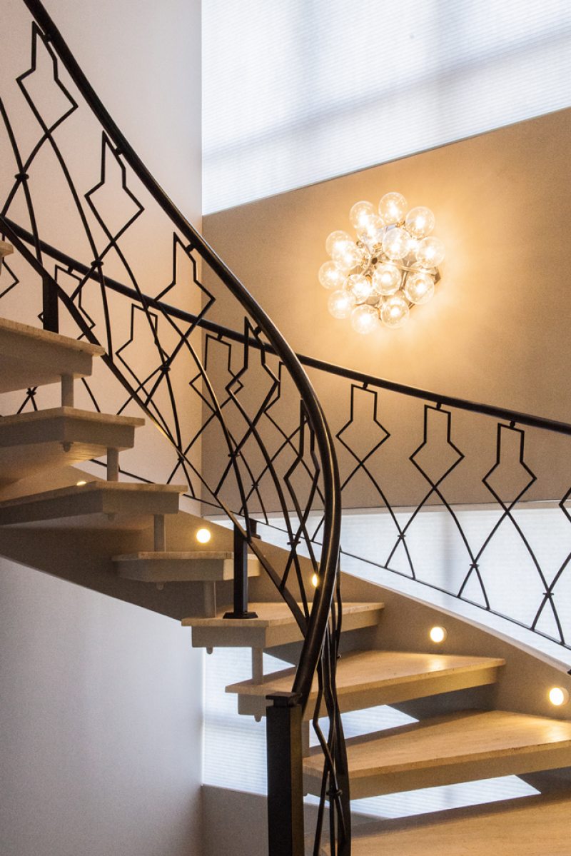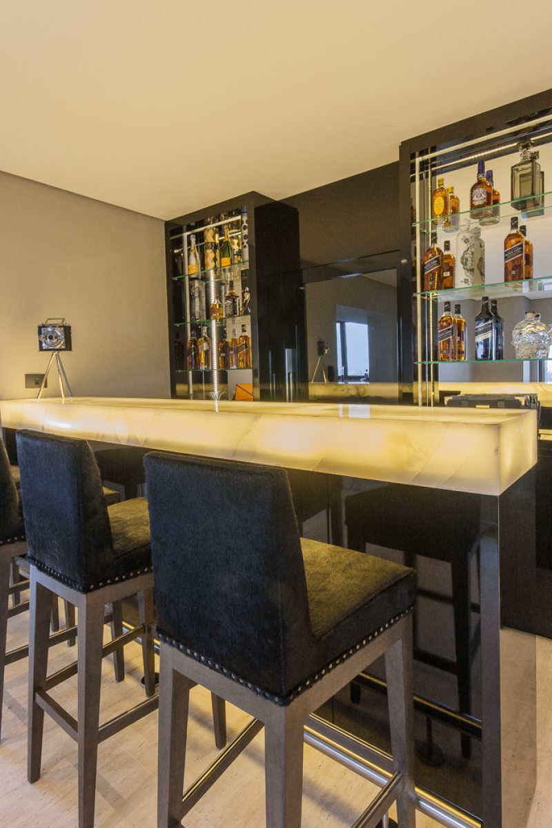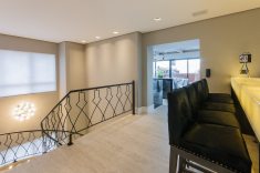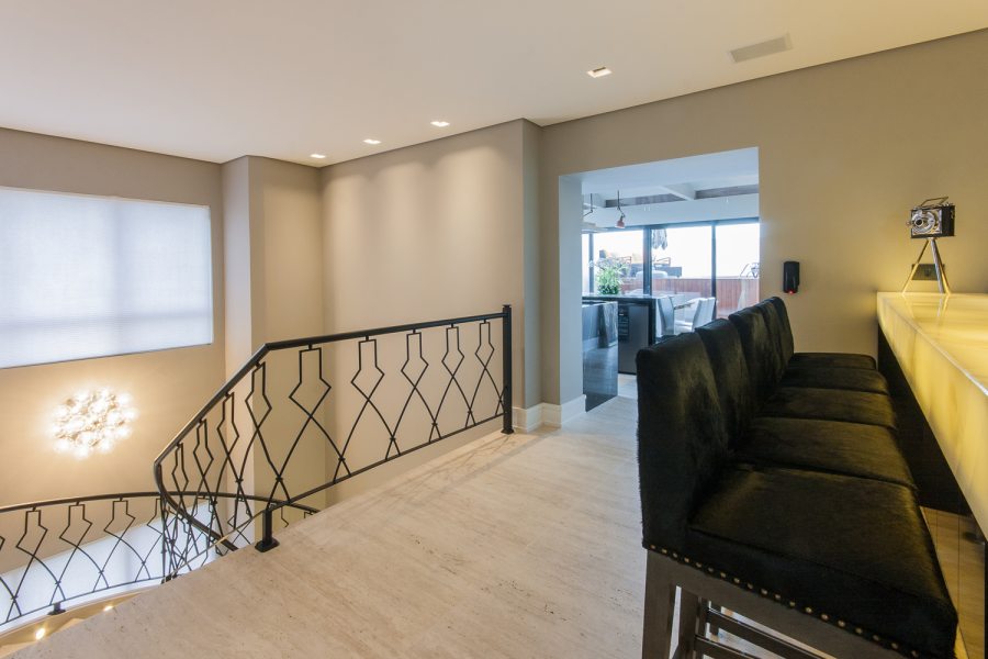 Passando para o segundo andar do apartamento, agora renovado, temos a escadaria com corrimão de ferro fundido e iluminada pela arandela Taraxacum, que leva ao bar com bancada em pedra ônix retroiluminada (Fotos na galeria). A proposta deste estar social é a incidência de iluminação natural e vista privilegiada tão amada pelos moradores.