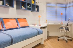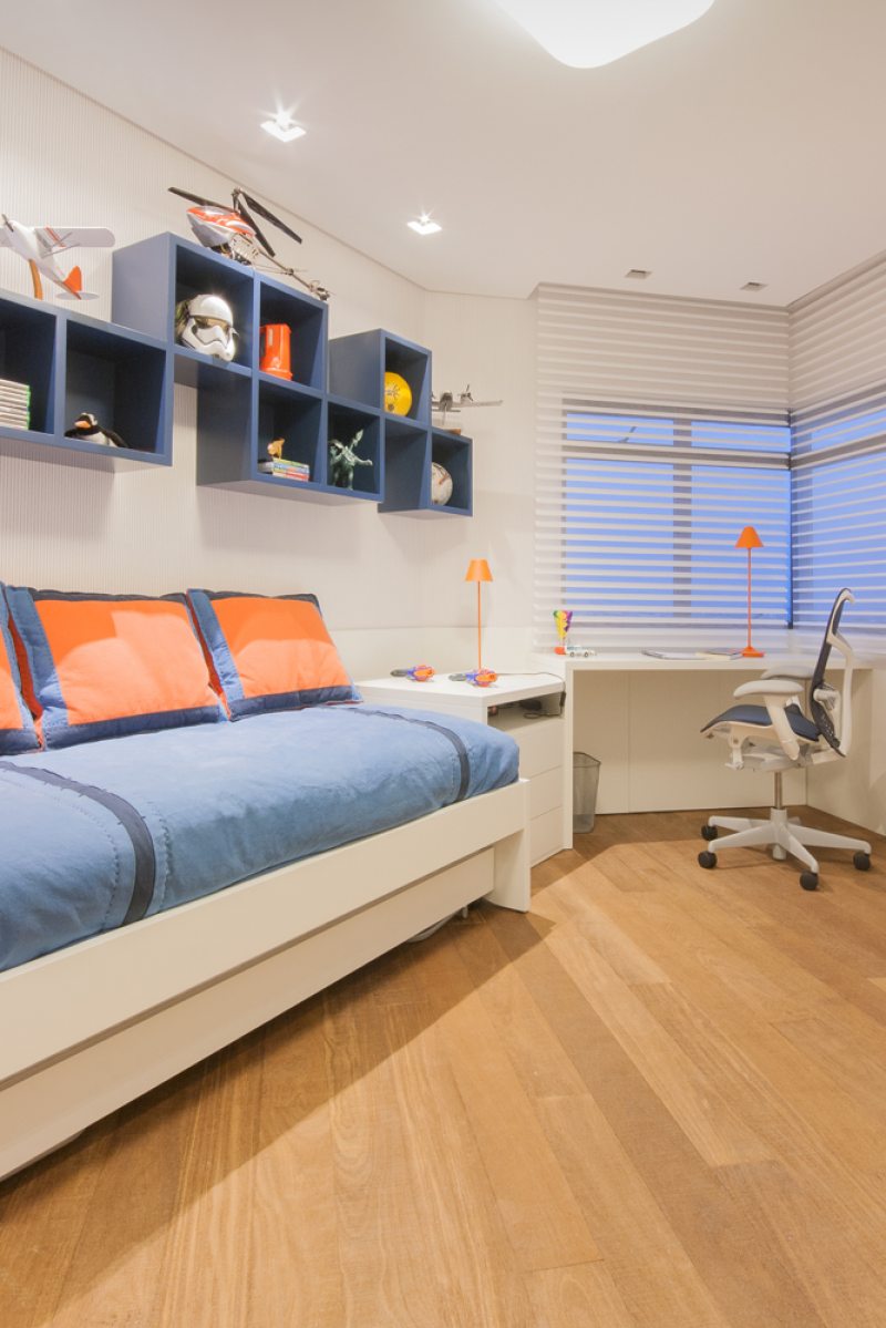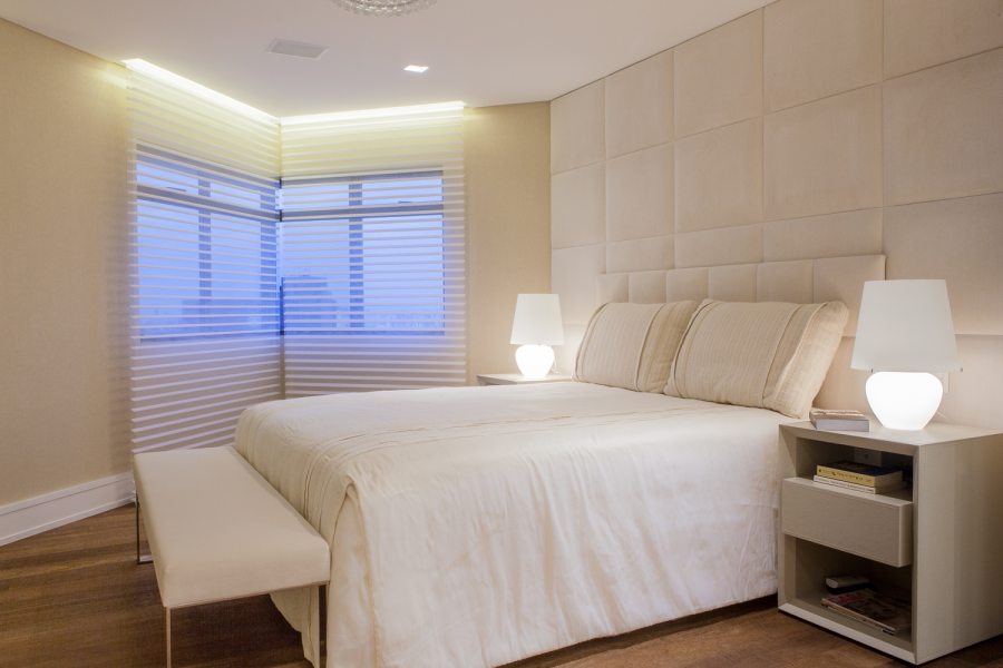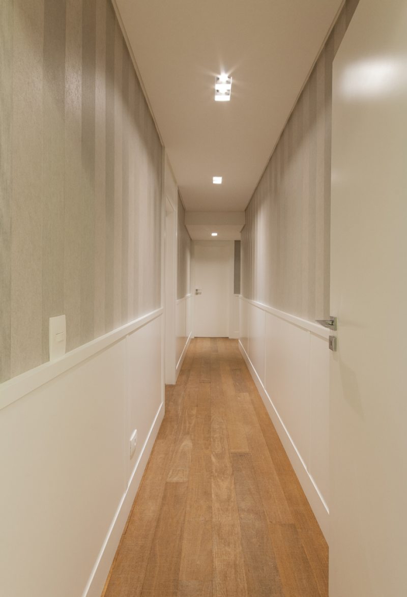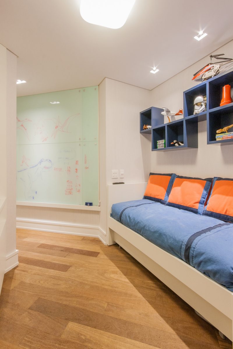 Em toda a extensão do apartamento, a iluminação é indireta e suave, sendo que no corredor dos dormitórios a madeira de demolição predomina. Internamente, os dormitórios incorporam a madeira de demolição do corredor, seja nos pisos ou nos papeis de parede. Na suíte máster, tecidos como linho e seda em tons de bege complementam o painel em couro e soltura de luz. O banheiro da suíte foi reduzido, tirando a banheira para dar espaço a um closet que não existia antes, e ainda recebeu renovação completa. Com revestimentos claros e em harmonia com o restante do projeto, o banheiro mais clean se destaca pela luxuosidade. No quarto do filho do casal, o protagonista é uma parede em vidro que pode ser usada para rabiscos com caneta, e também incorpora marcenaria branca e azul em meio à itens infantis.