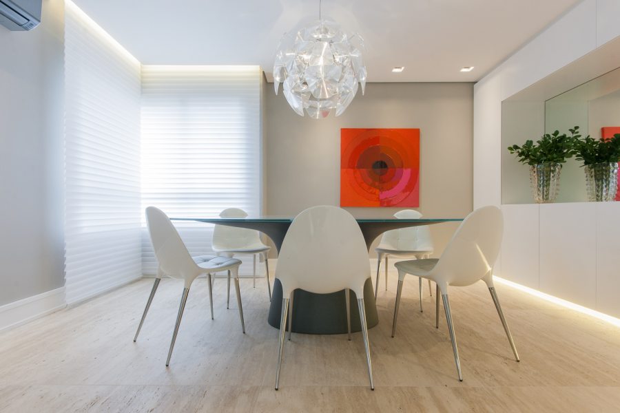Logo na entrada, um grande espelho recepciona quem chega ao apartamento. Na sala de estar, uma porta de correr separa o home office com lareira em mármore Travertino Romano, poltronas, quadro (SIM Galeria) e iluminação agradável para leitura. Adentrando o duplex, temos a charmosa copa com pendente Hope e cadeiras de couro (Montenapoleone) e a cozinha, que agora integra a lavanderia no novo projeto.