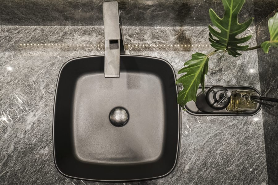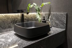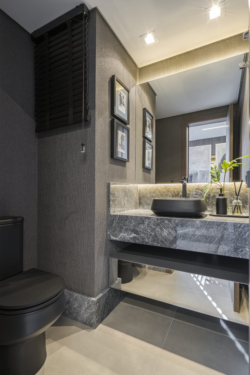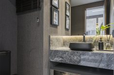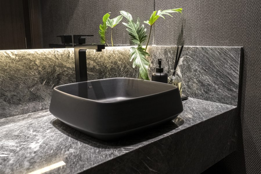 Na área de trabalho, as bancadas e mesas integradas oferecem espaço de sobra para a leitura de projetos e análise de materiais. Além de estimular a colaboração, o layout permite diversas configurações para se adaptar a expansões sem a necessidade de grandes reformas. O lavabo finaliza o projeto com chave de ouro, dando destaque para o sofisticado jogo de texturas da bancada de mármore e das louças sanitárias Ébano Fosco da Deca. O projeto é um cartão de visitas à altura dos clientes mais exigentes.