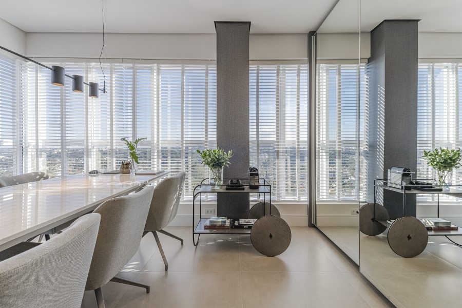 “Escolhemos a Impermix pela qualidade dos produtos, pela delicadeza do design das peças e pela parceria de anos com o escritório. É uma empresa muito séria e comprometida, dando toda a assistência ao cliente desde a venda até o pós venda.” – elogiou Viviane. O piso de porcelanato Downtown, da Portinari, conectou o décor dos ambientes a partir da paleta de cores em tons de cinza e grafite. O décor das áreas dedicadas a receber clientes ficou muito mais impactante graças a elementos como mesa de mármore Pighês Athena, na sala de reuniões, e o painel da TV em mármore Gris Navaggio.