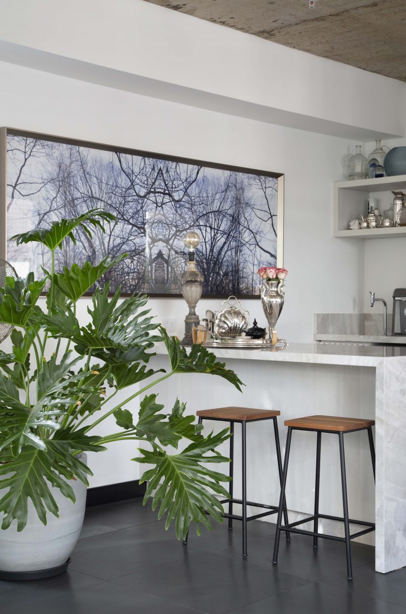 O estilo aconchegante ganha funcionalidade com uma copa/bar, que possibilita desde refeições rápidas, até jantares com clientes e brindes de comemoração. O espaço também é cenário para as lives gastronômicas que os profissionais costumam gravar para suas redes sociais. A bancada, assim como pias de lavabo e mesas de criação, é revestida em Mármore Branco Paraná.