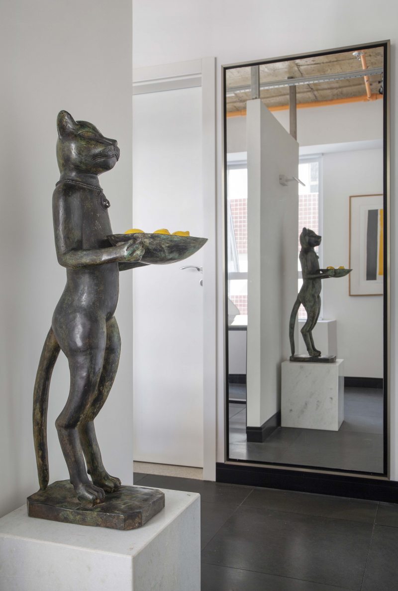 Divisórias de drywall foram utilizadas nas laterais das mesas de projetos para setorizar o hall de entrada e a mesa de reuniões. Os tons neutros contrastam harmonicamente com o piso elevado em ardósia negra que, além de trazer personalidade, é super versátil para futuras alterações de layout, já que as placas podem ser levantadas para transformações.