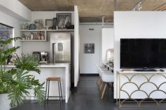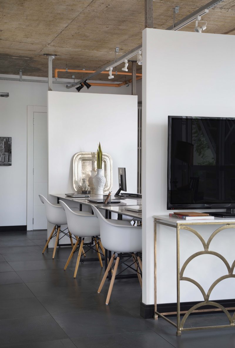 O ar industrial fica por conta do teto em concreto, com tubulações e calhas elétricas aparentes, além do lustre acima da mesa de reuniões. Os móveis planejados também receberam calha de led, para criar uma iluminação mais moderna e intimista.