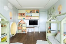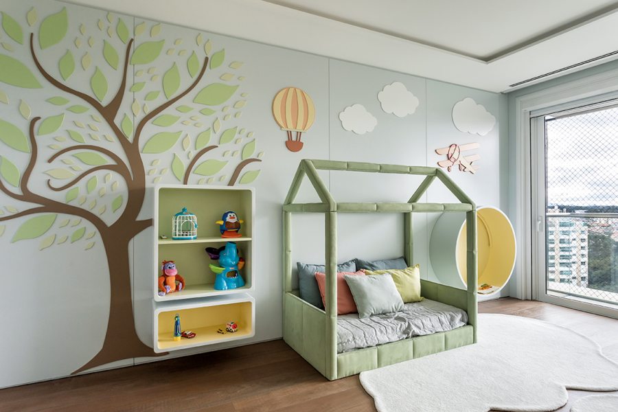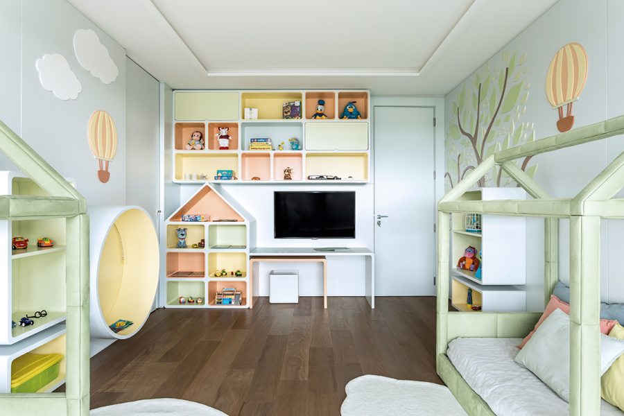 No quarto das crianças, Margit explorou tons pastel que vão do verde claro ao amarelo. A temática lúdica, com balões, nuvens e árvores aplicados nas paredes, é evidenciada pelo mobiliário sob medida em formato de casinha. “As caminhas foram desenhadas pelo escritório e executadas pela Marcenaria Móveis Mota para posteriormente serem estofadas e revestidas em camurça. Assim, elas ficaram ainda mais confortáveis para as crianças”, explica.