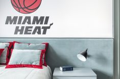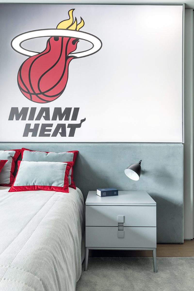 Para a suíte do menino, painel iluminado destacando a marca do time americano de basquete Miami Heat. O espaço também recebeu área de estudos e painéis em laca, todos executados sob medida pela Marcenaria Móveis Mota. A cabeceira em veludo e o enxoval reproduzem a paleta de cores do ambiente.