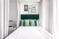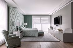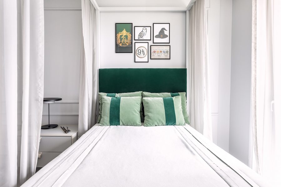 Na suíte máster, a cor verde aparece em destaque tanto no painel de cabeceira em veludo quanto nas cortinas e no mobiliário solto. Um grande painel em laca brilhante, executado sob medida (Marcenaria Móveis Mota), abriga a televisão. A suíte da menina foi inspirada nas salas comunais da Sonserina, como descritas na série de livros de Harry Potter. As paredes receberam painéis de laca desenhados pelo escritório com detalhes temáticos, executados pela Marcenaria Móveis Mota, e pontos na cor verde para a cabeceira e enxoval. A cama com dossel também foi feita sob medida pela Marcenaria Móveis Mota, com desenho assinado por Margit, e estrutura para dossel. Sobre a cabeceira, quadros com imagens de livros arrematam o décor.