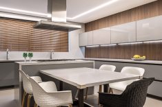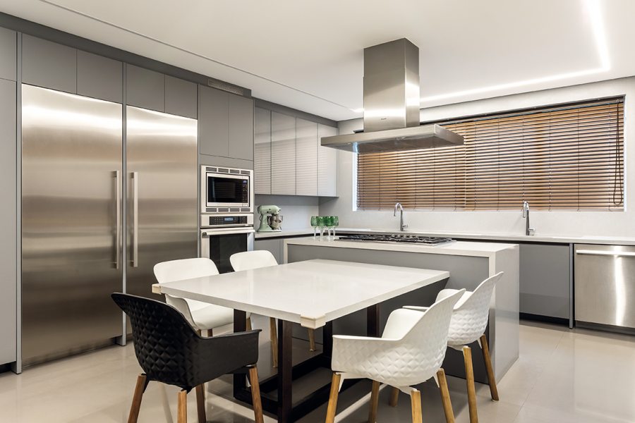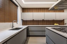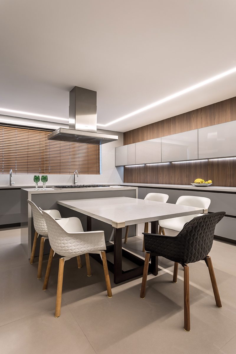 A cozinha, originalmente branca, foi repaginada para transformar-se em um espaço mais convidativo. Por isso, a profissional apostou no uso da madeira no mobiliário (Ornare) e persianas para criar o ambiente acolhedor desejado. A iluminação indireta suave finaliza a cozinha.