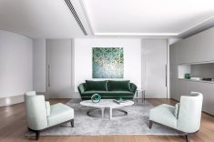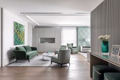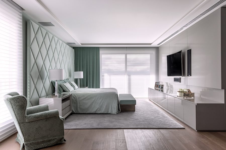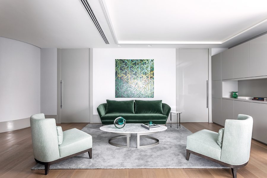 A paleta de cores neutras é contrabalançada pelo uso de tonalidades verdes em móveis soltos e detalhes específicos, como a cabeceira da suíte máster, e obras de arte. Para criar espaços acolhedores, Margit apostou em materiais suaves ao toque, como linho, veludo e camurça. O mobiliário em laca é realçado pela iluminação indireta e abajures decorativos.