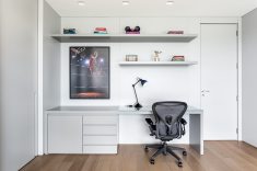 Um dos grandes destaques do projeto é o uso da marcenaria sob medida: Muitos dos painéis dos quartos, camas, nichos, armários e escrivaninhas foram desenhados pelo escritório e executados pela Marcenaria Móveis Mota, o que permitiu imprimir ainda mais personalidade nos espaços”, elogia Margit.