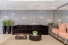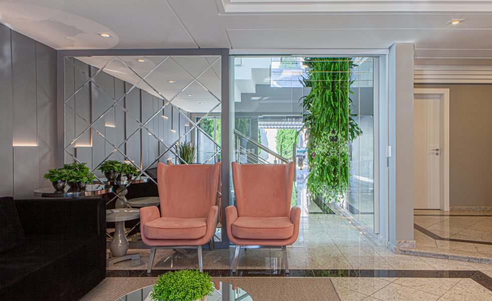 Na área social o cor-de-rosa das poltronas conferiu um toque romântico ao décor que, todavia, se manteve moderno quando combinado aos tons de chocolate e cinza dos revestimentos e estofados. A vegetação abundante, instalada em vasos e paredes espalhadas pelos diferentes espaços, acrescentou ainda mais personalidade ao resultado final. Seja romântico ou despojado, moderno ou tradicional, este projeto tem tudo para agradar a qualquer convidado.