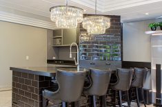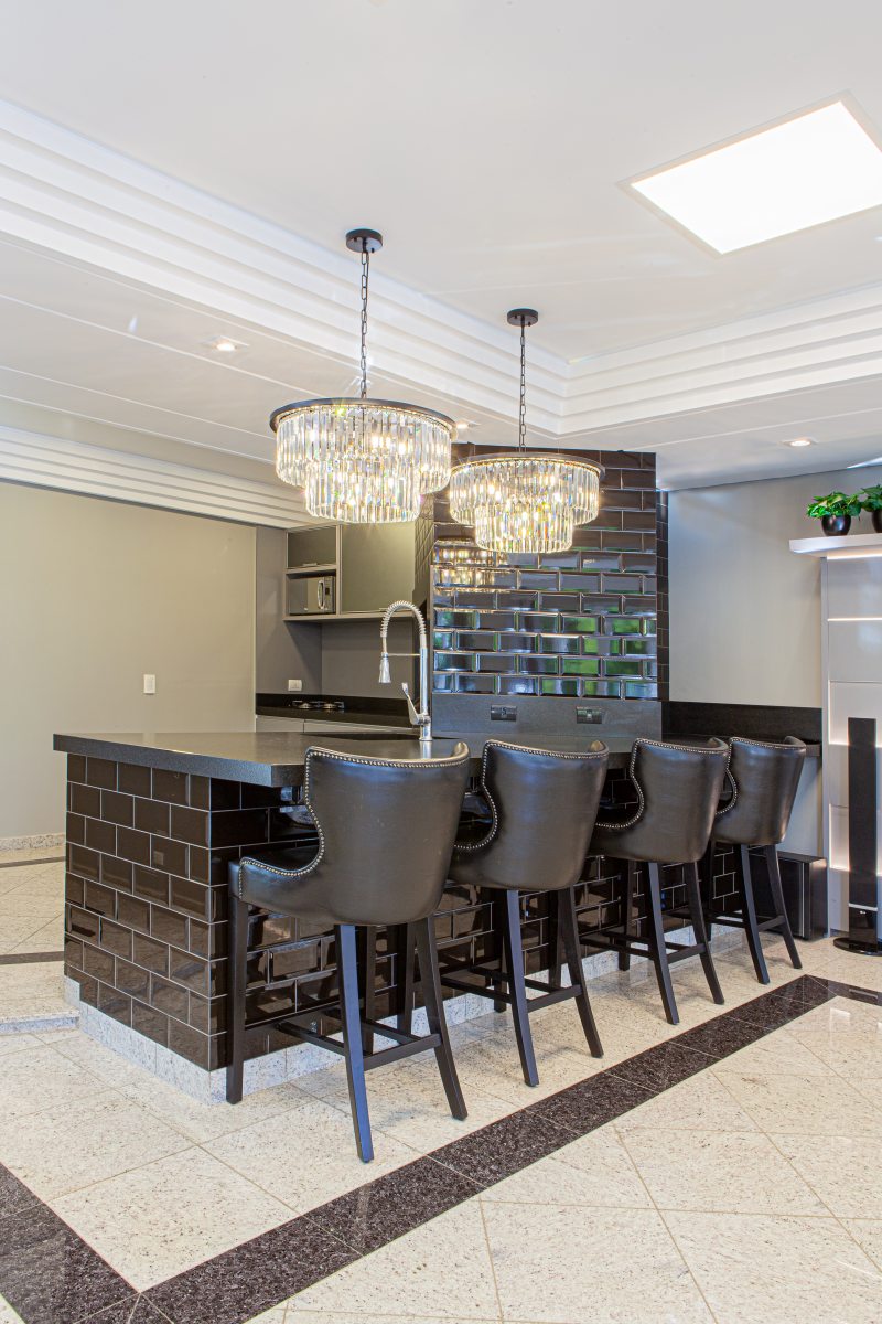 Esta residência em Colombo/PR ganhou uma área social digna de grandes celebrações graças ao projeto da arquiteta Hellen Giacomitti. O espaço de 150m² recebeu grandes janelas e pisos de porcelanato espelhado, além de espelhos bisotê geométricos, valorizando a iluminação natural e garantindo a leveza do décor. Os ladrilhos e a bancada do espaço gourmet receberam cores sóbrias que, combinadas a lustres e banquetas de estilo tradicional, equilibraram a delicadeza do décor da área social e criaram um interessante jogo de contrastes.