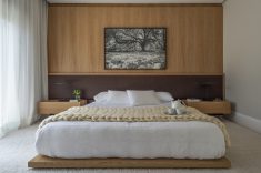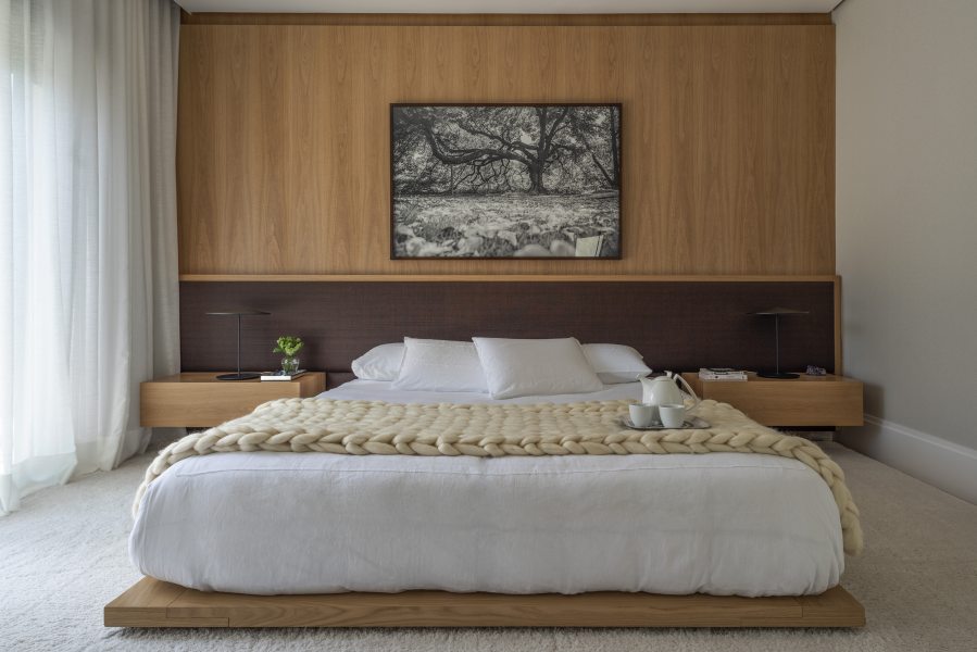 A suíte master possui tons monocromáticos e, apesar da estética contemporânea, também carrega referências orientais, como a cama baixa em base de madeira.