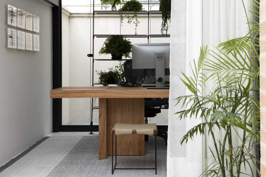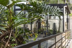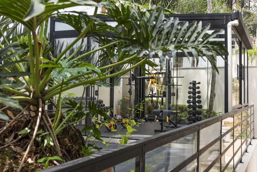 Atrás da casa, a área de circulação lateral, pouco utilizada, foi convertida em um espaço de ginástica completo e em um home office totalmente equipado.