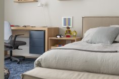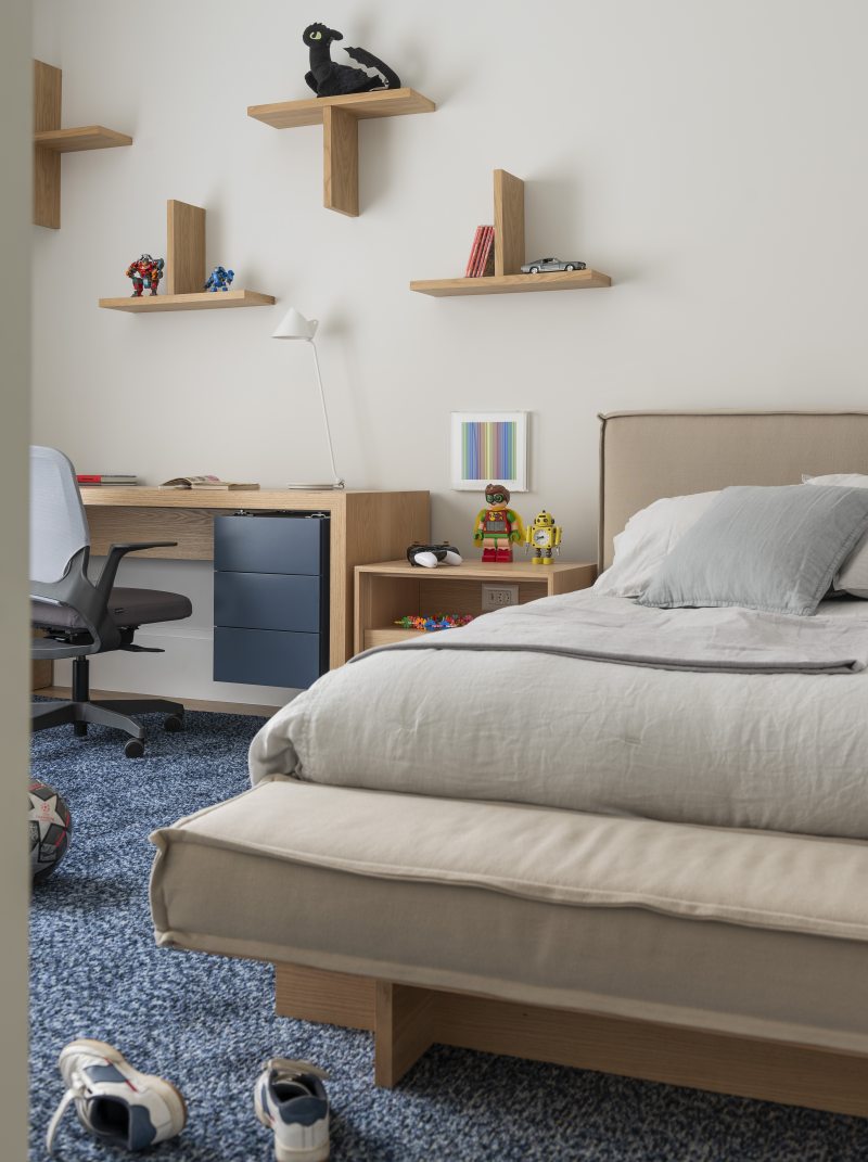 Os quartos dos dois filhos seguem a mesma linguagem, com personalização em tons de azul e verde. Confira mais imagens em nossa galeria!
