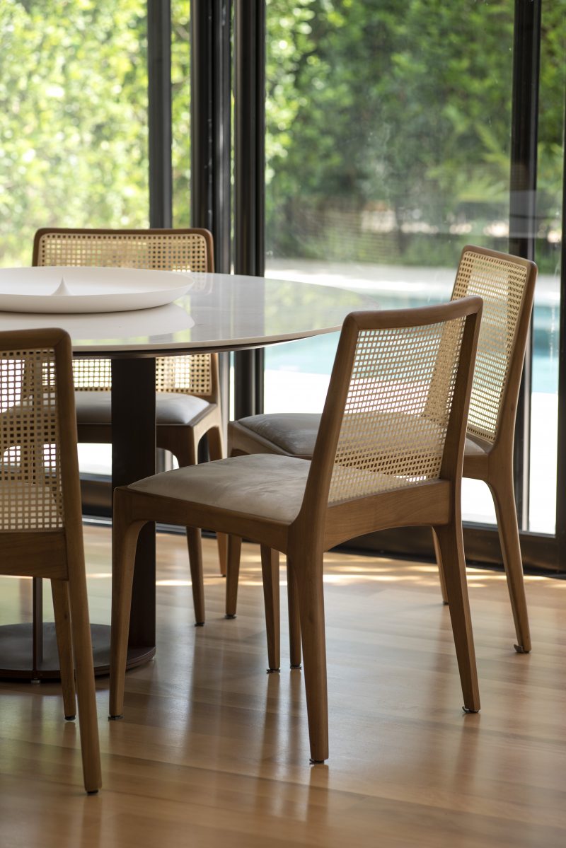 No térreo, a integração ao jardim, que abraça todo o terreno, conecta os espaços com vãos de abertura máxima. Cada textura dos revestimentos e dos tapetes foi cuidadosamente selecionada pelo cliente, valorizando opções que resultassem em ambientes acolhedores, atemporais, e confortáveis para os momentos de convivência familiar.