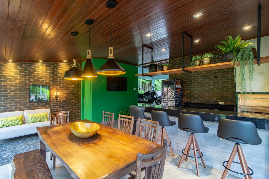 Onde: Curitiba • 21 de Maio - 2019 | Fotos Dea FylykOs clientes sentiam falta de um ambiente maior na residência para receber amigos e familiares. Uma área anexa construída no amplo jardim, nos fundos da casa, resolveu o problema