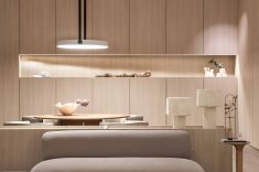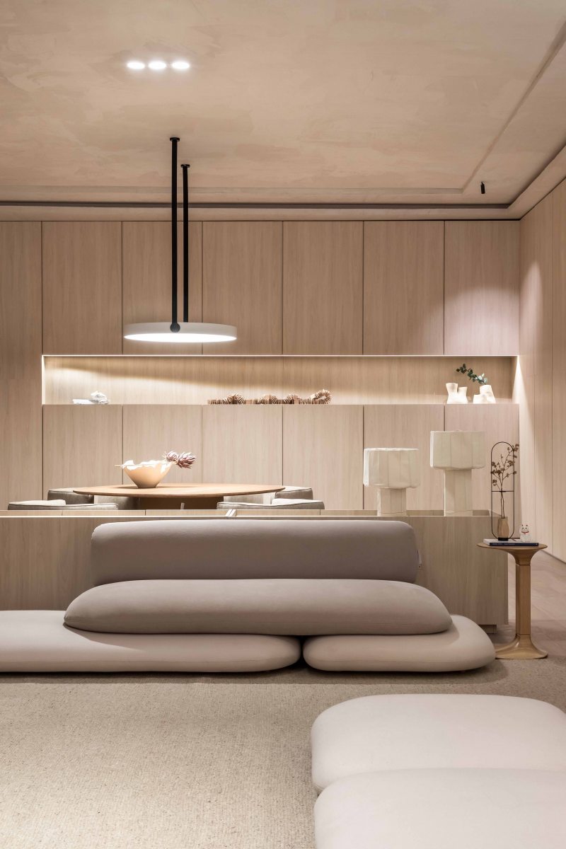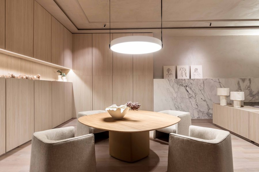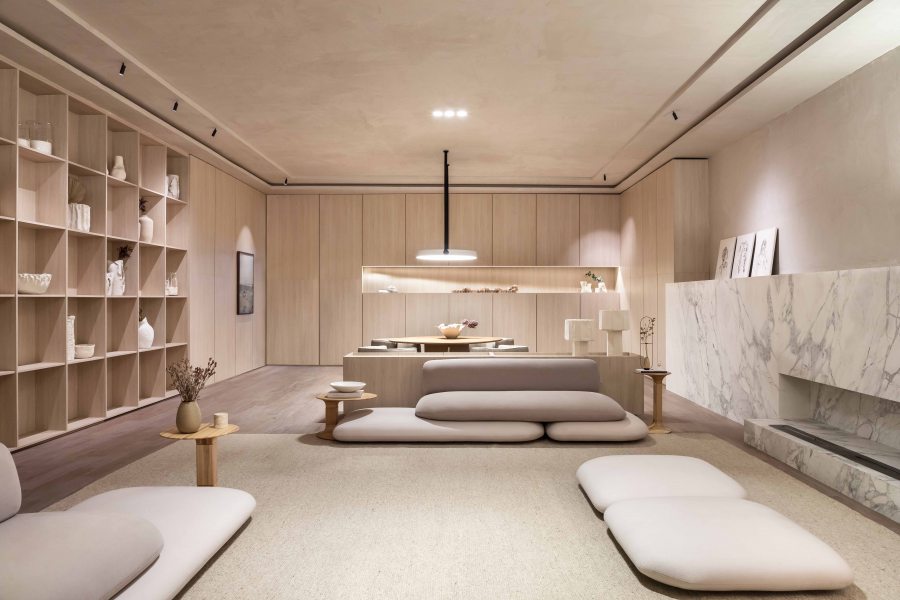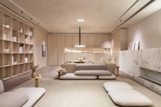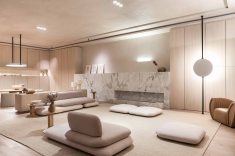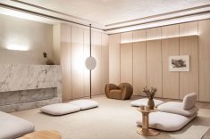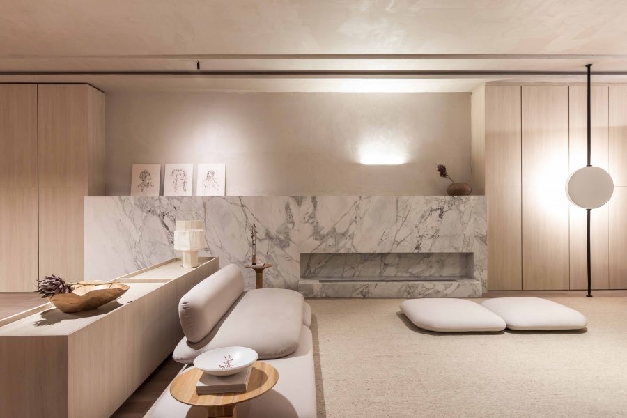 O piso estruturado de Carvalho Stone, fornecido pela Base Sólida, foi utilizado em todo o ambiente e combinado a uma lareira de pedra natural e mobiliário de linhas orgânicas distribuídos ao redor do tapete de rattan. A iluminação indireta acolhedora e os objetos decorativos que remetem à natureza completaram o espaço. A julgar a longa história do estilo Japandi e sua capacidade de permanecer relevante, este estilo continuará entre as tendências de décor por muito tempo.