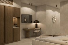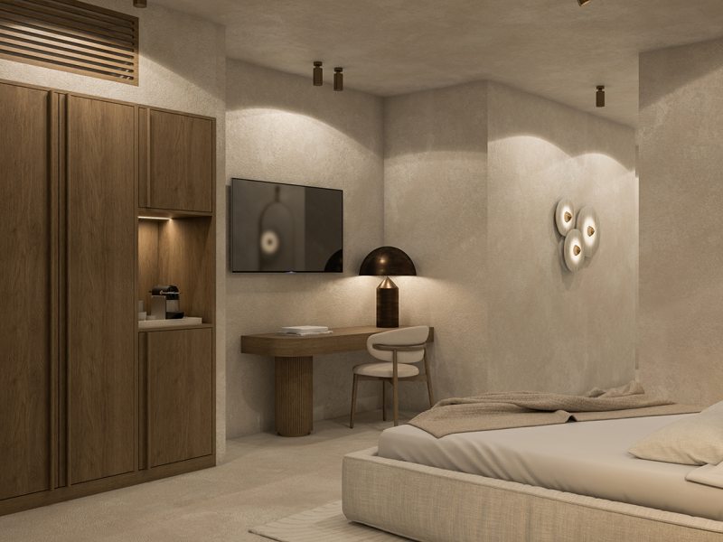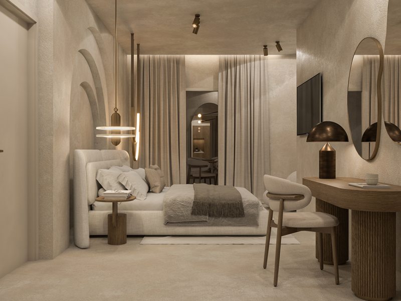 Os quartos também ganham cara nova e sob a liderança da designer de interiores Viviana Diamantidou, a decoração possui inspiração na beleza natural de Santorini, em que utiliza tons claros para criar uma atmosfera harmoniosa com a ilha.