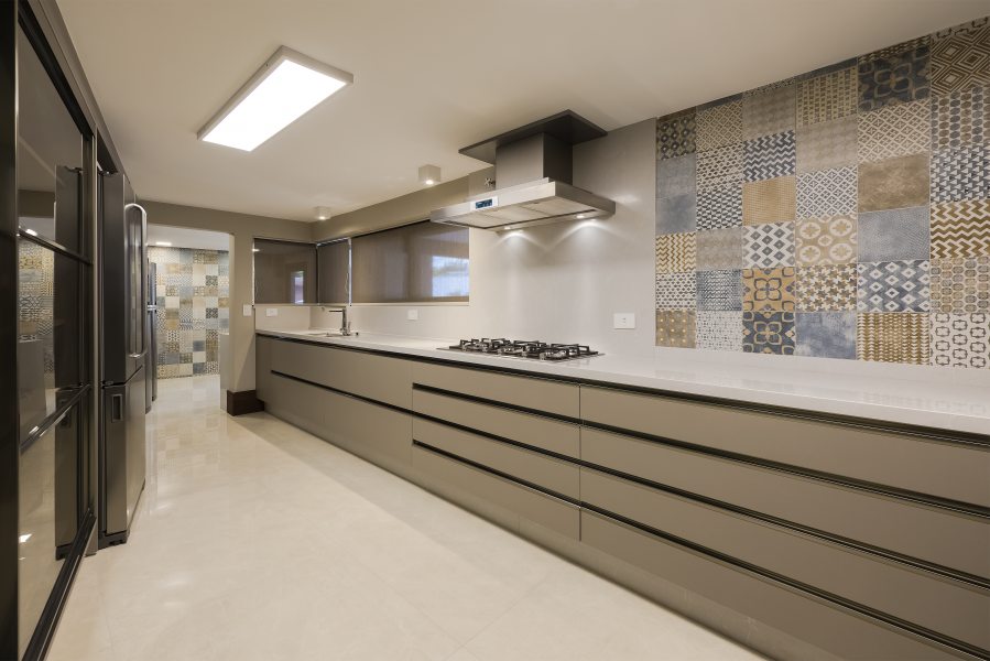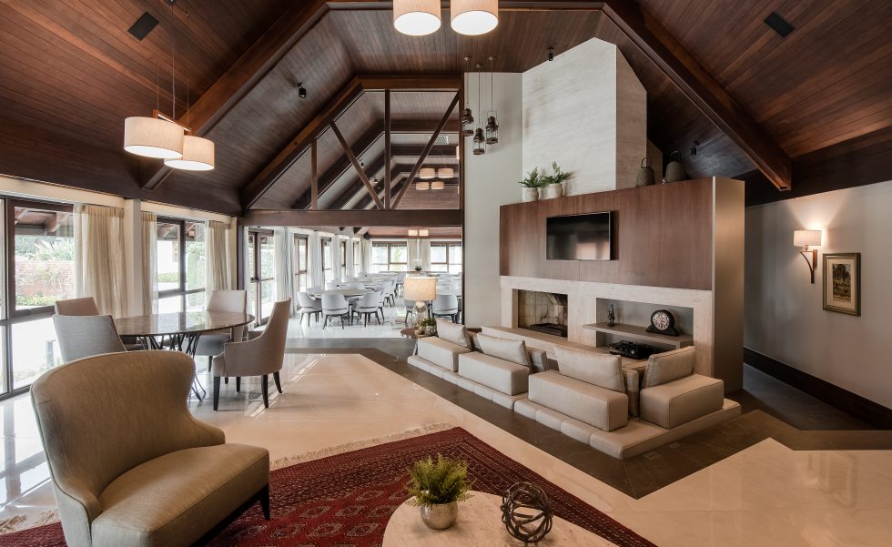 Os quase 450m2 de projeto, podem ser divididos em 2 ambientes principais. Uma porta painel, com detalhes em madeira original, pode limitar fisicamente os ambientes ou integrá-los 100%. O primeiro espaço, um estar para receber, com lareira, sofás e uma mesa para pequeno jantar, uma espécie de sala ampliada para festas menores e mais intimistas. Nela uma cozinha super funcional, foi ampliada, alterando o acesso do lavabo para o hall de entrada e deixando o espaço mais funcional e organizado para preparar os banquetes e festas.