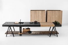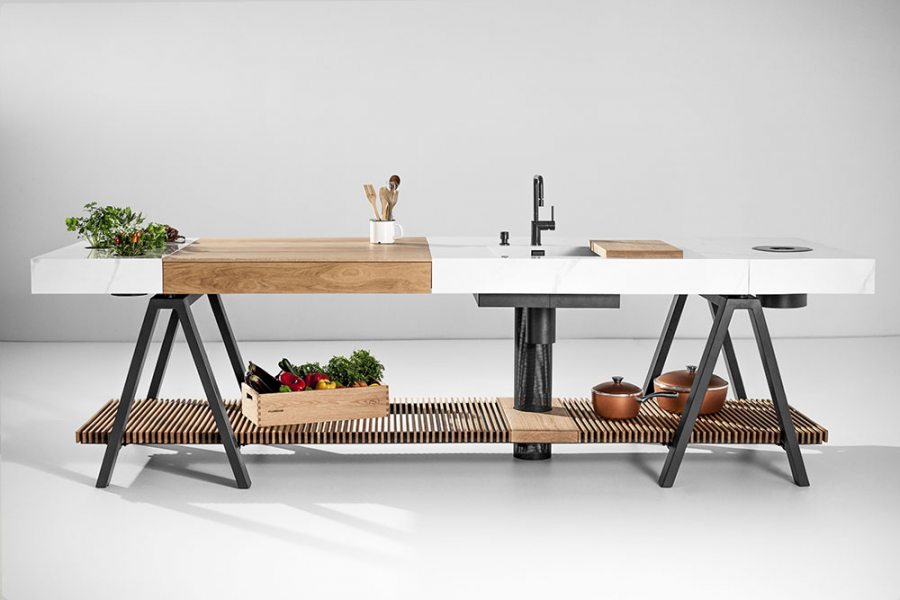 A bancada é toda construída com componentes nobres, uma síntese de poucos elementos bem selecionados e bem combinados: madeira maciça de carvalho, pedras Dekton, para receber um cooktop, lixeira, cuba e até uma horta. O projeto é sempre personalizado de acordo com a preferência e uso de cada cliente, para atender totalmente às necessidades e ao estilo de vida de cada pessoa. A madeira é de carvalho maciço, com certificação e proteção antibacteriana.