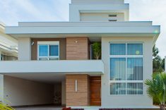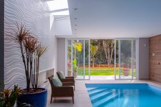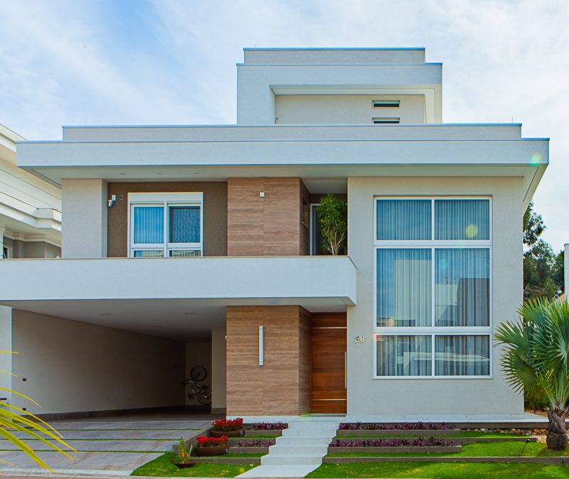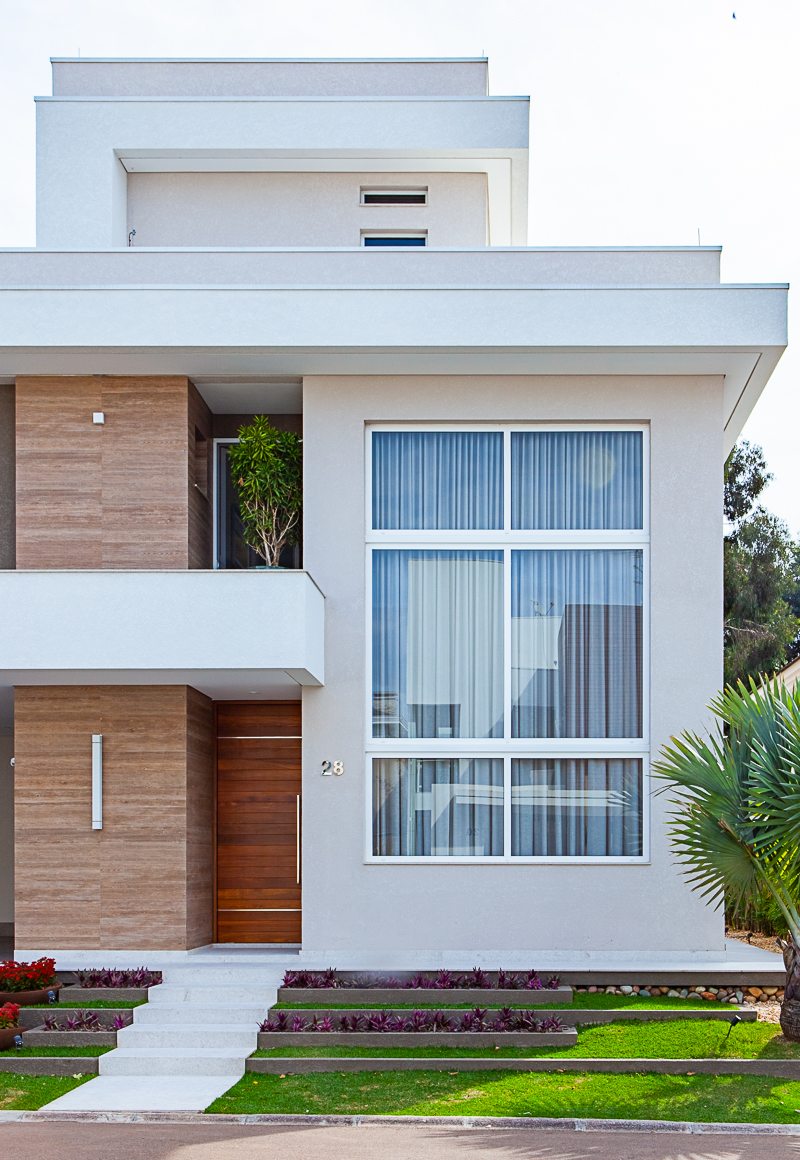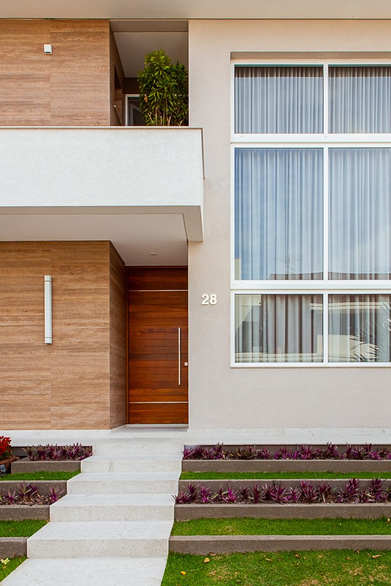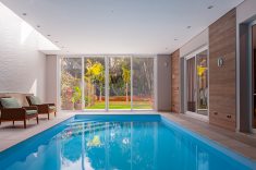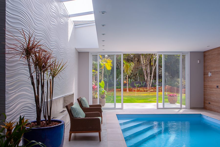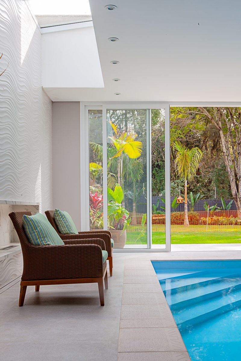 Nesta residência de 549 m², situada em um condomínio fechado no Mossunguê, em Curitiba, a concepção do projeto arquitetônico levou em conta a inclusão de uma piscina coberta junto à cozinha e churrasqueira, valorizando a integração com a área externa aos fundos, como conta o arquiteto Gilberto Ken-Ichi Inoue, um dos responsáveis pelo projeto arquitetônico e execução da obra, em parceria com a arquiteta Andreza Regina Simião e os engenheiros civis, Egon Lima e Muriel Santos.