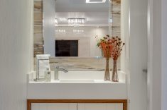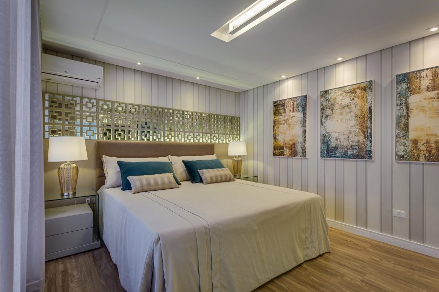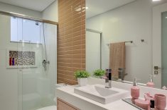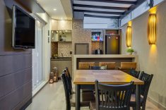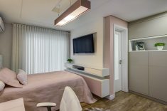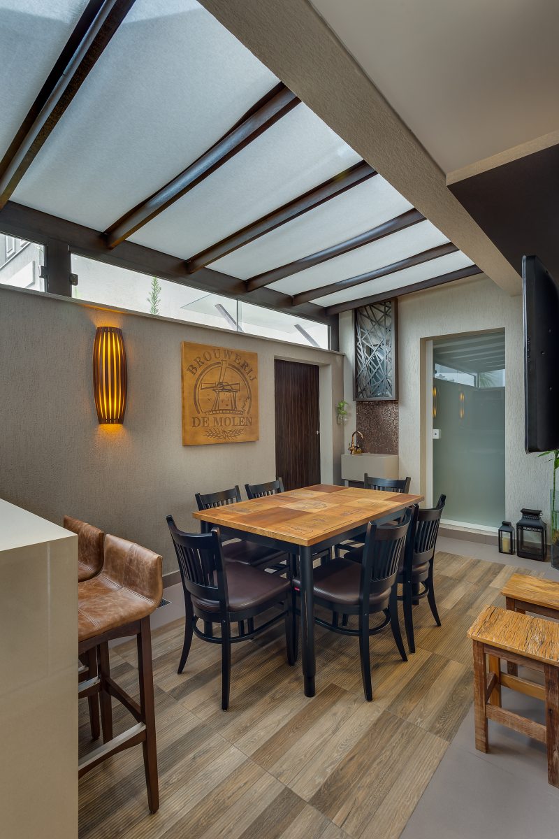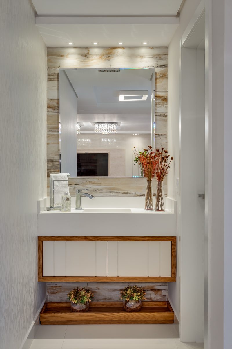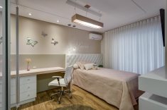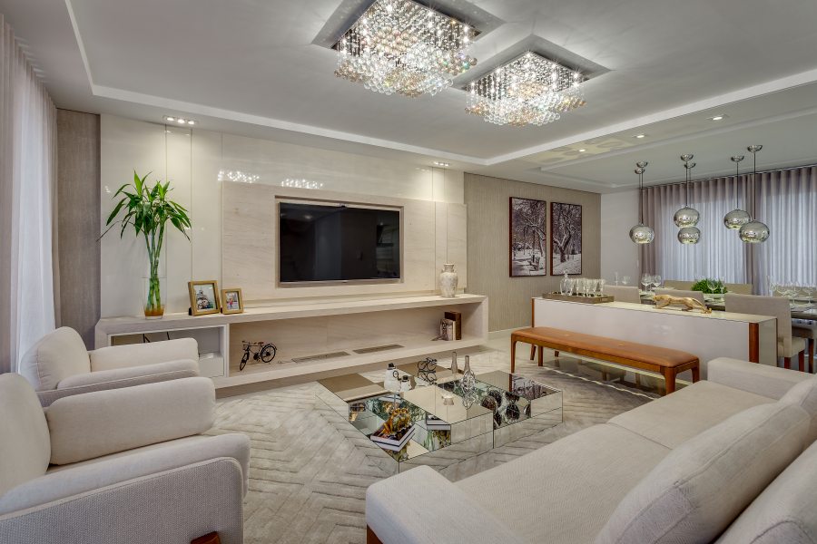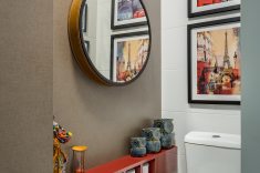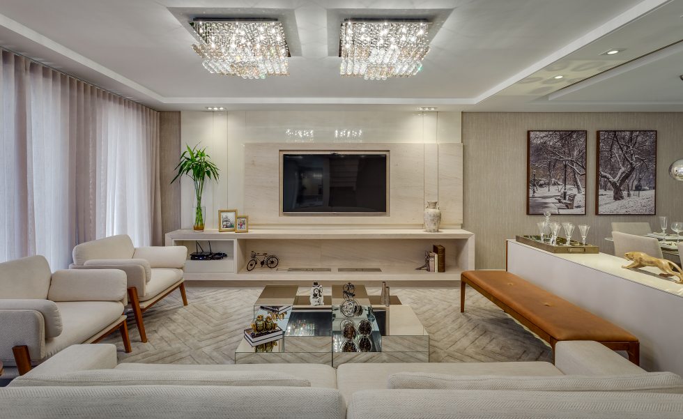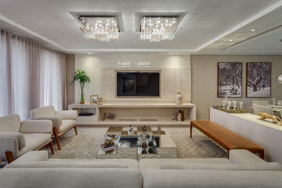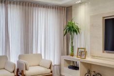 Sair de um pequeno apartamento para uma casa maior foi um sonho que se realizou para o jovem casal morador desta casa de 200 m² no bairro Hugo Lange, em Curitiba. O imóvel foi comprado pronto da construtora e entregue já com revestimentos e gesso bem definidos. “O projeto buscou seguir o layout original da casa, inserindo novos elementos, como iluminação, automação, ar-condicionado, piso vinílico, cortinas, papel de parede e revestimentos novos, aplicados sobre os já existentes”, explica a arquiteta Angela Setim, responsável pela repaginação, concluída em um ano e meio. Na sala de estar com sala de jantar integrada, o painel da TV e a lareira foram executados em Limestone Vermont Anticato, com dois queimadores a álcool. O luminotécnico, garimpado na Grey House, traz plafons quadrados de cristal