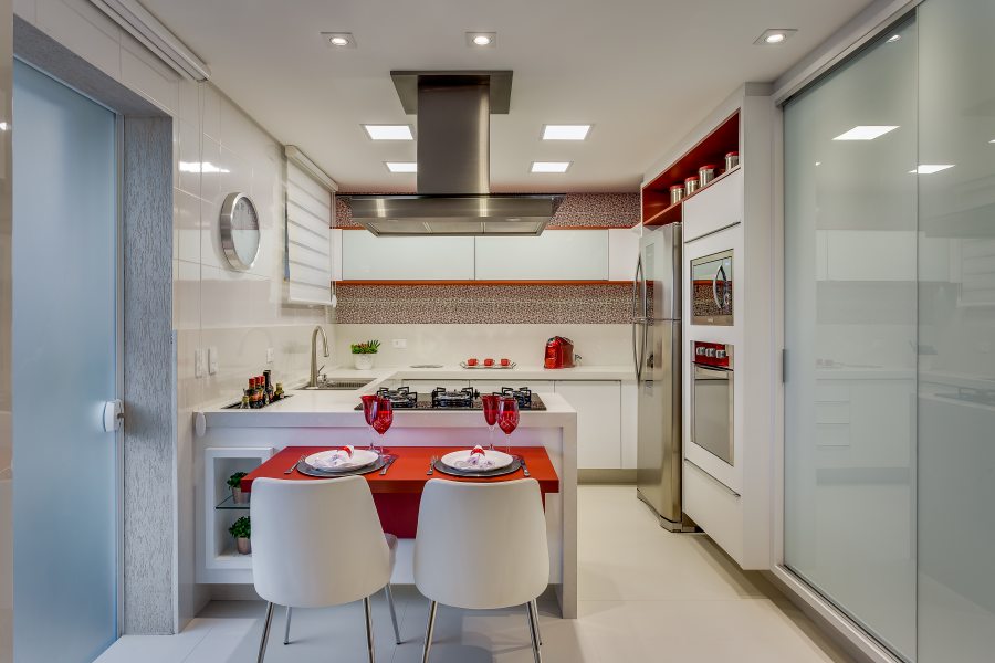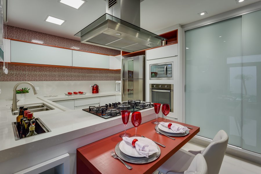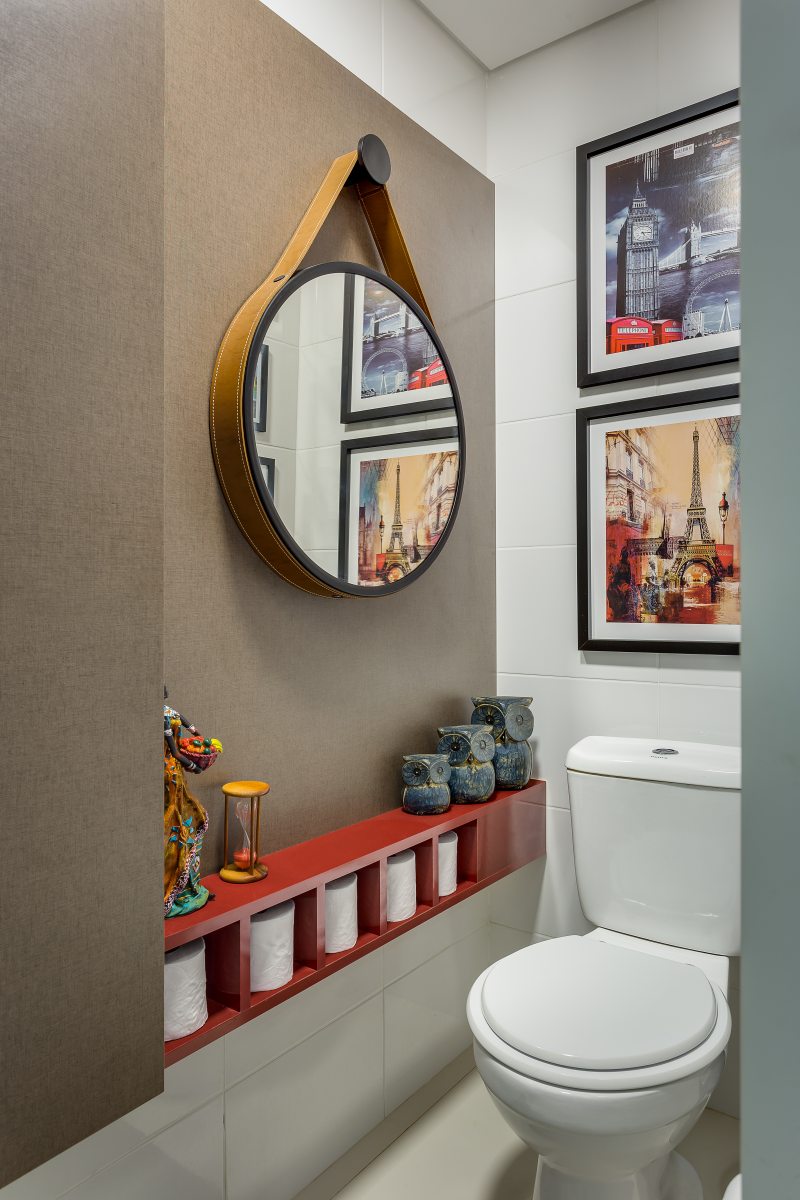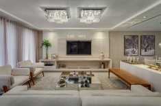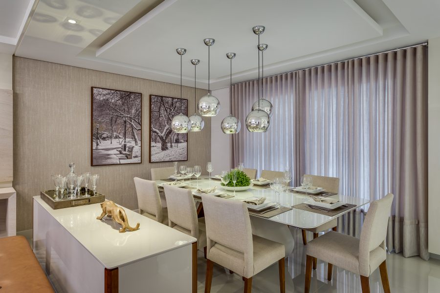 e iluminação de apoio. Na sala de jantar pendentes decorativos fixados em alturas diferentes criam movimento. O mobiliário, papéis de parede, cortinas e persianas foram todos adquiridos na M. Decor: “Os produtos da M. Decor possuem design e acabamentos diferenciados e a loja sempre nos atendeu muito bem", aponta a profissional.