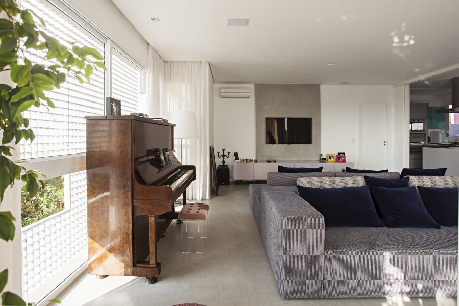 A conexão emocional proporcionada pela decoração afetiva é fundamental para estabelecer um vínculo profundo entre o morador e sua casa. Nesse ambiente integrado, que combina sala de TV e living, o piano antigo ganha destaque representando uma herança de família valorizada no projeto | Projeto do escritório Korman Arquitetos | Foto: Gui Morelli